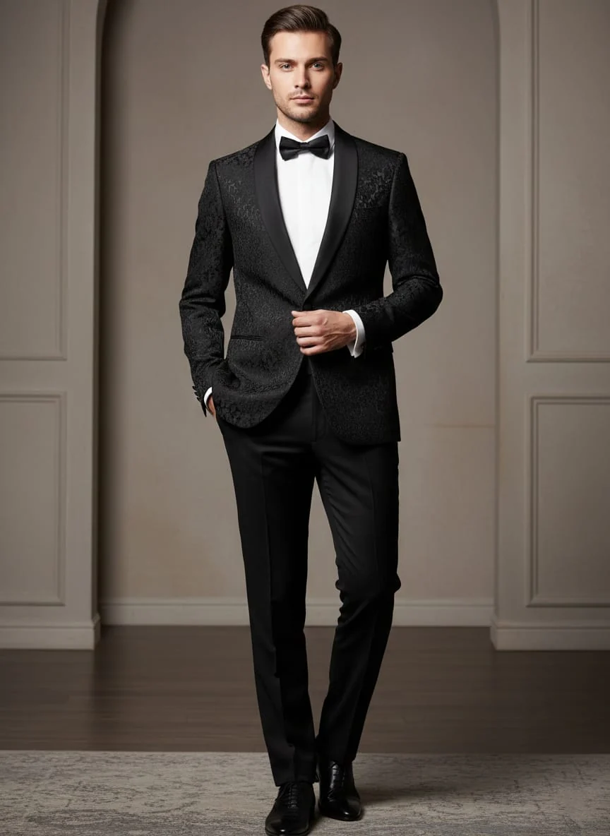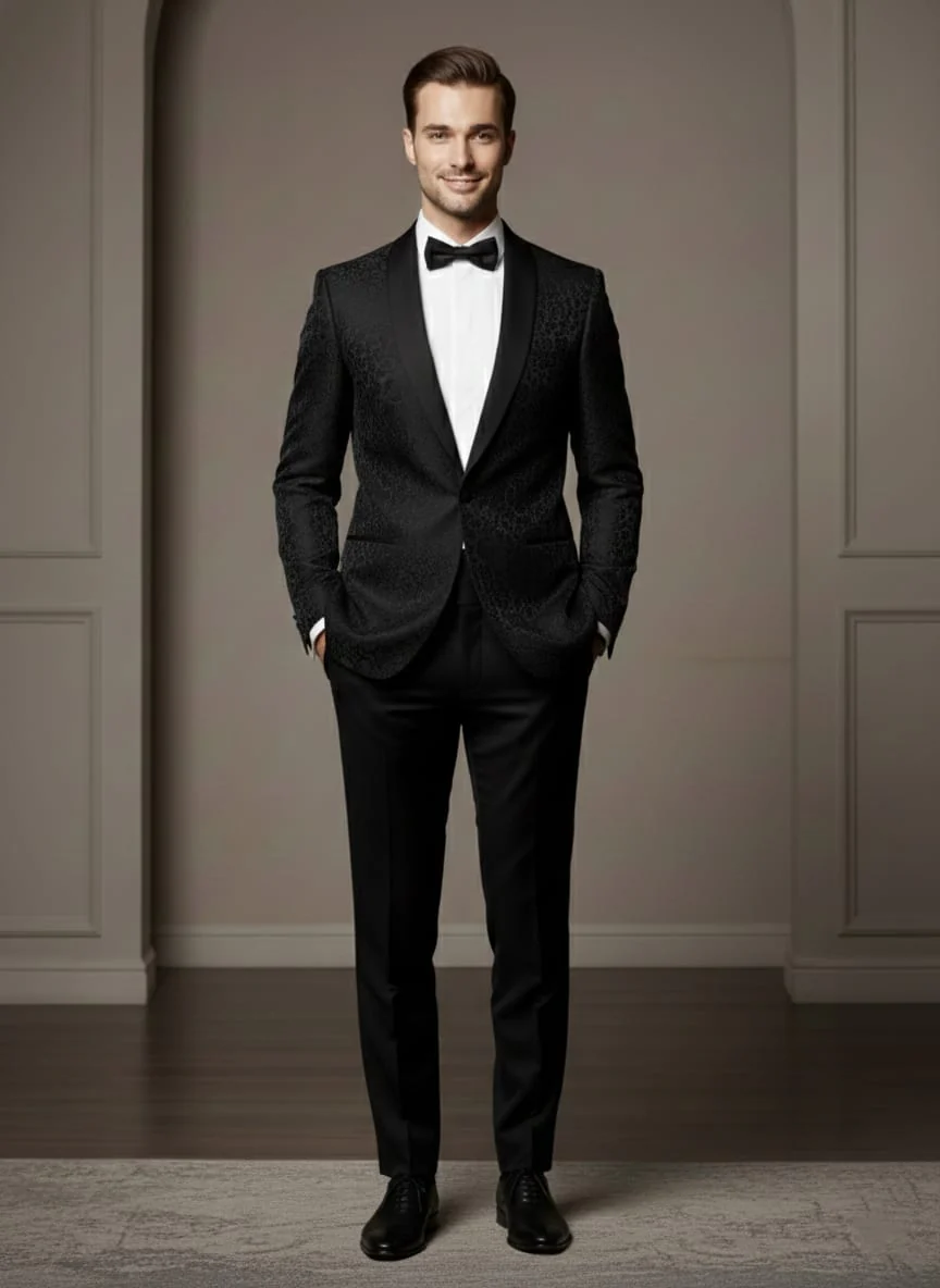 Questo completo รจ la quintessenza dello stile e del lusso. La giacca damascata nera conferisce un’aura di eleganza e distinzione, mentre la vestibilitร  aderente esalta la silhouette. Lasciatevi conquistare dall’esclusivitร  di questo smoking nero damascato.