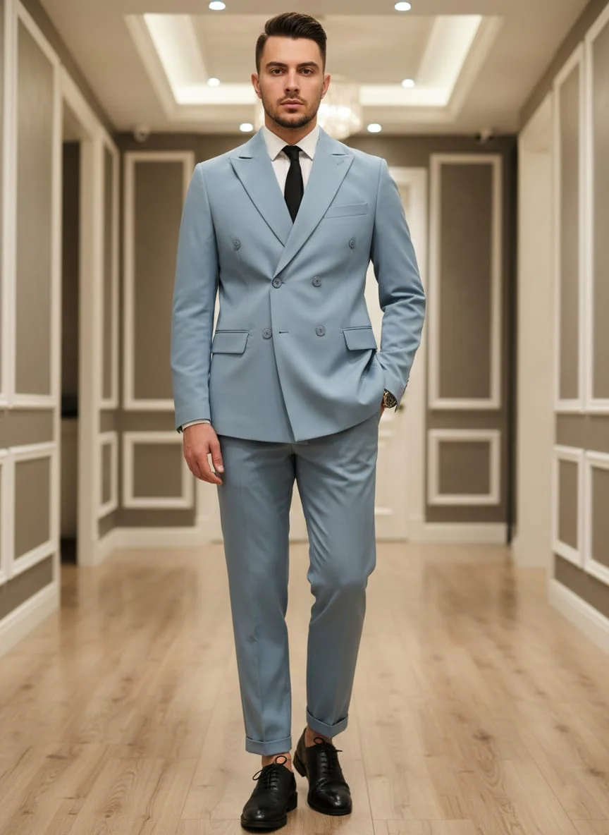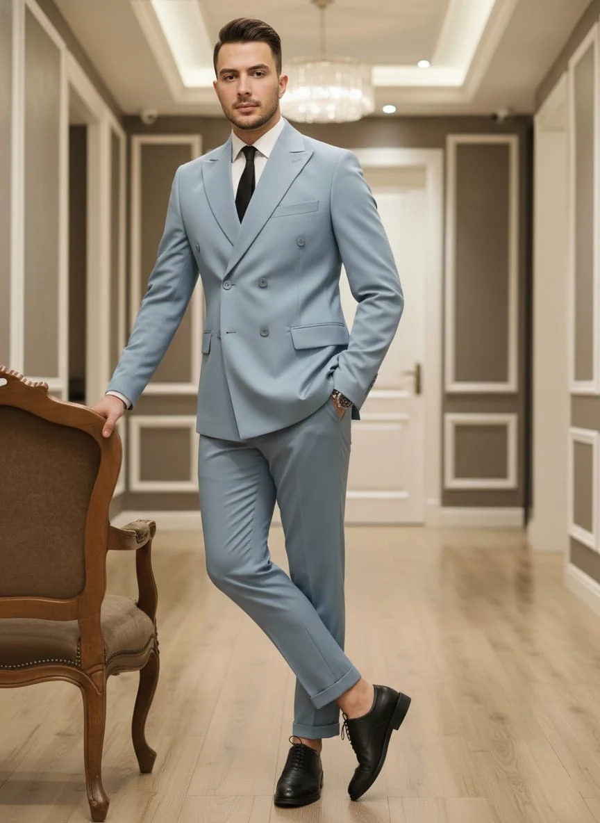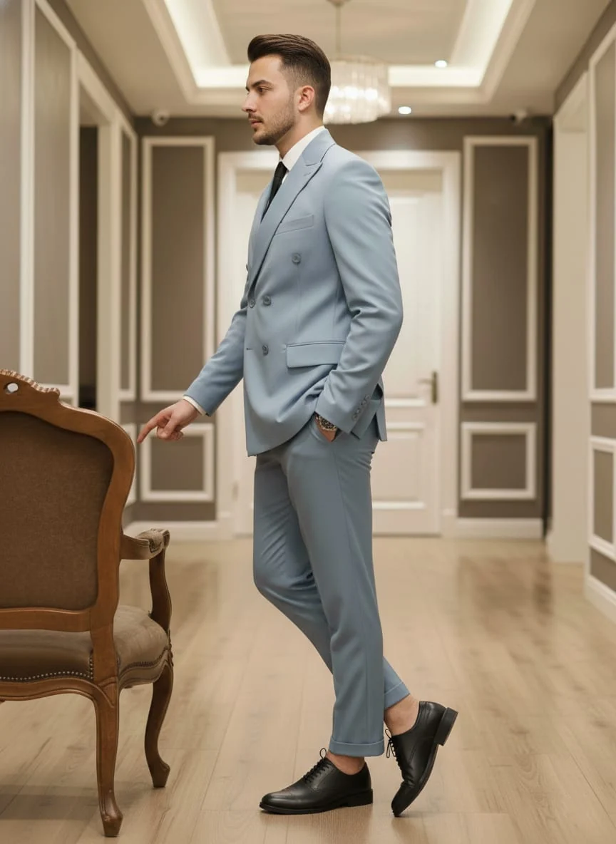 L’abito doppio petto celeste polvere รจ un capo elegante e versatile, perfetto per ogni occasione. Realizzato con tessuto elasticizzato e leggero, garantisce un fit aderente e comodo per tutta la giornata. Il modello slim e il pantalone capri aggiungono un tocco moderno e originale al tuo stile. Prodotto in Italia con tessuto estivo in poliviscosa per un look fresco e raffinato.