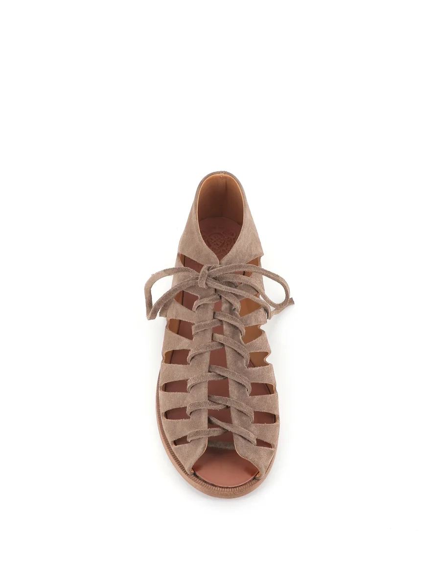 Sandalo donna Alberto Fasciani color vigogna, realizzato in camoscio, caratterizzato da tomaia e lacci a taglio vivo. Suola in cuoio. Interno foderato. Lavorazione artigianale.