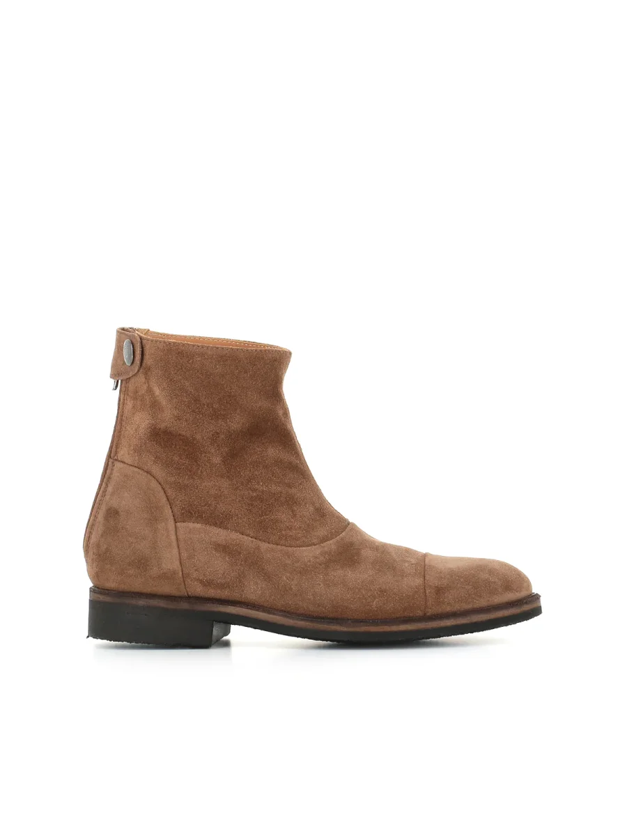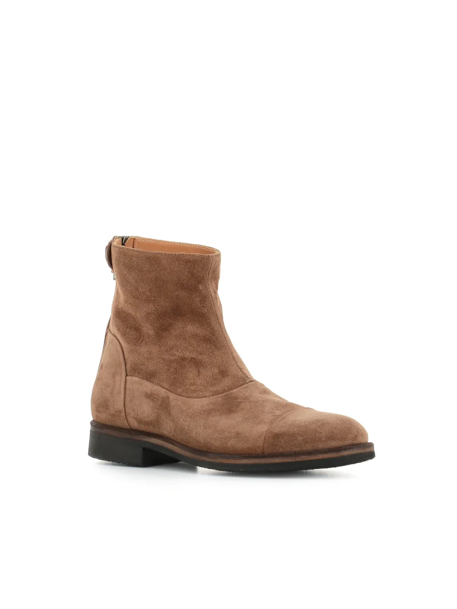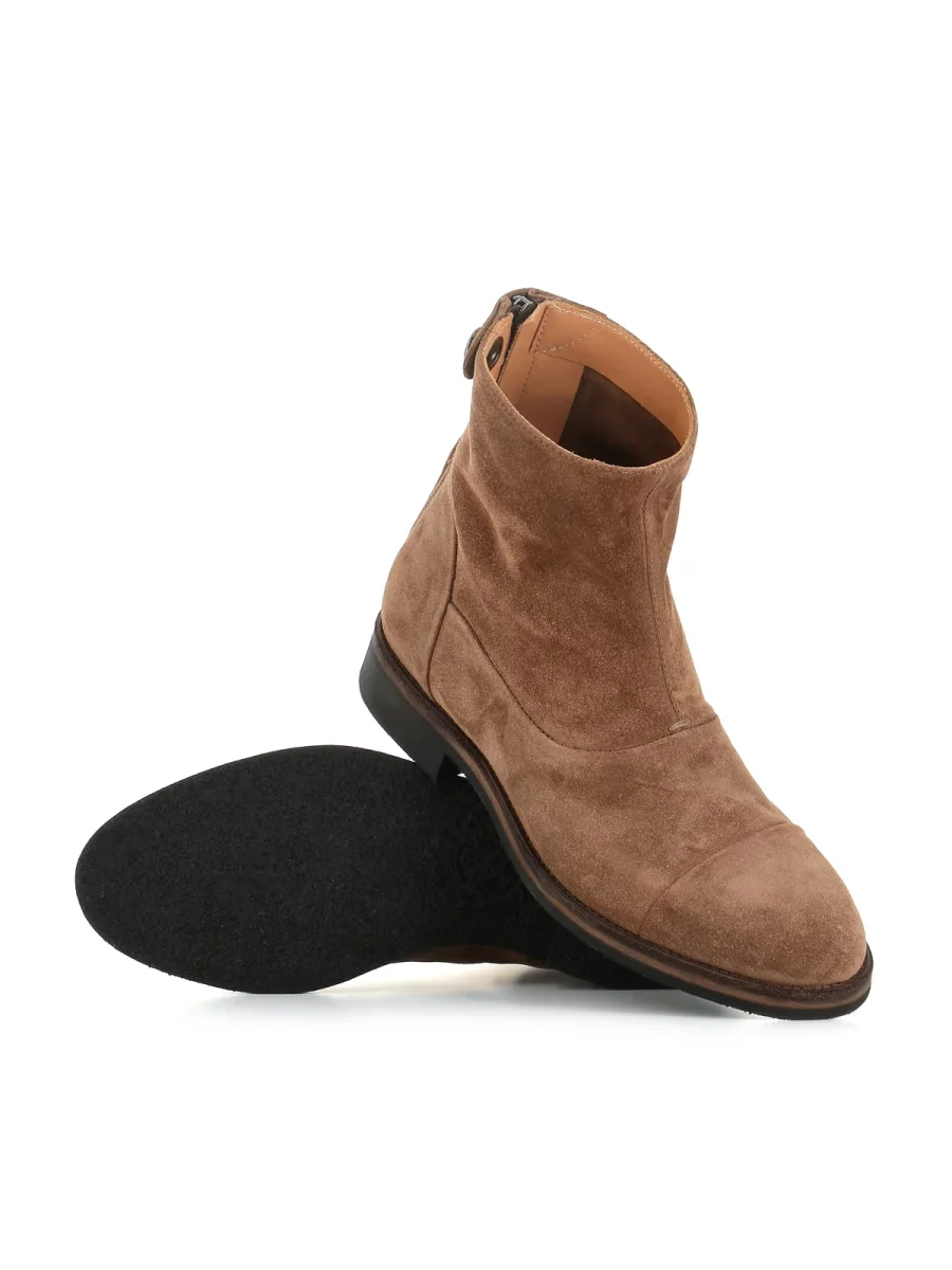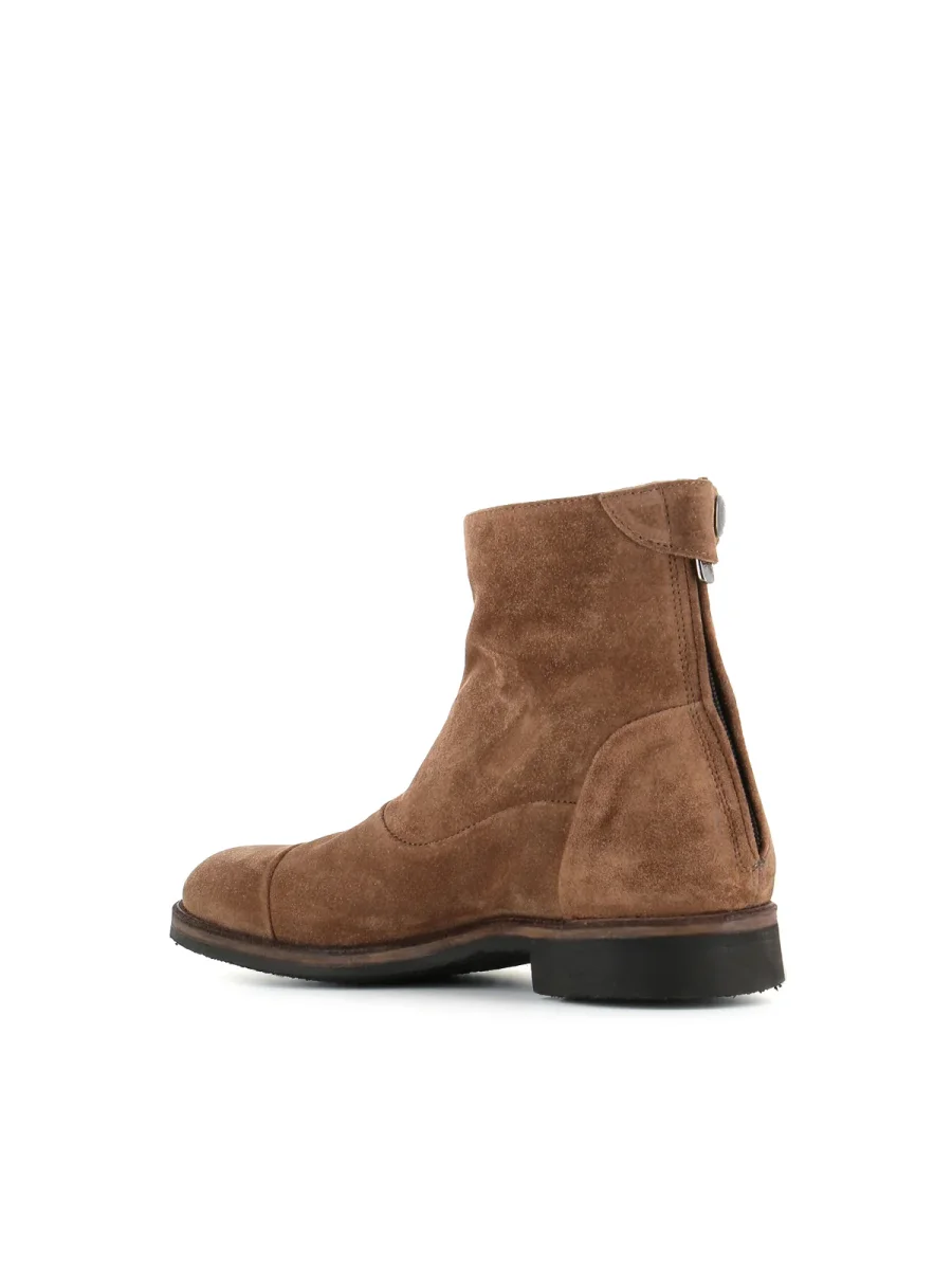 Stivaletto Alberto Fasciani color beige scuro, realizzato in camoscio, caratterizzato da una chiusura posteriore con zip e bottone a pressione. Fondo in crepe. Interno sfoderato. Lavorazione artigianale.