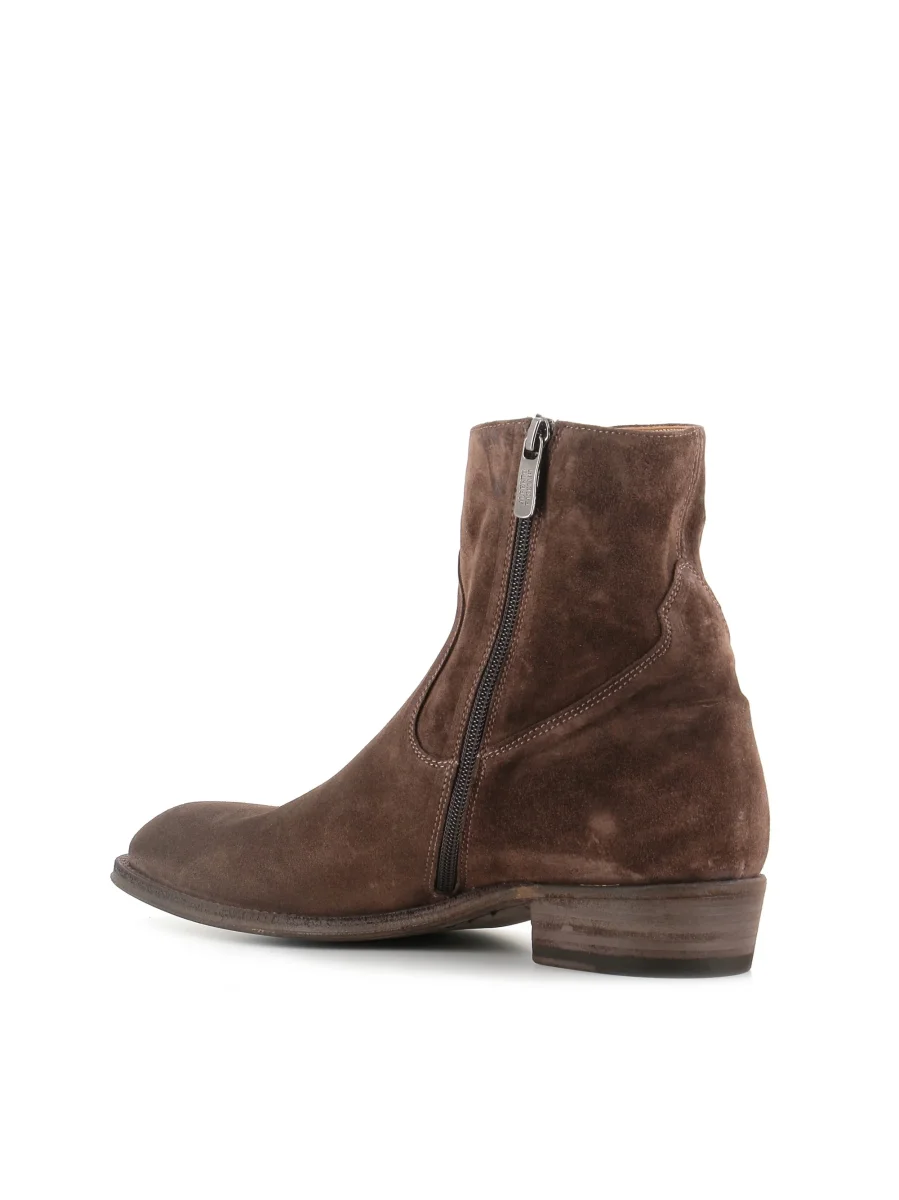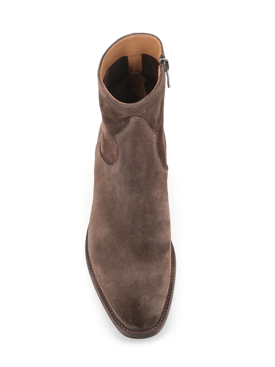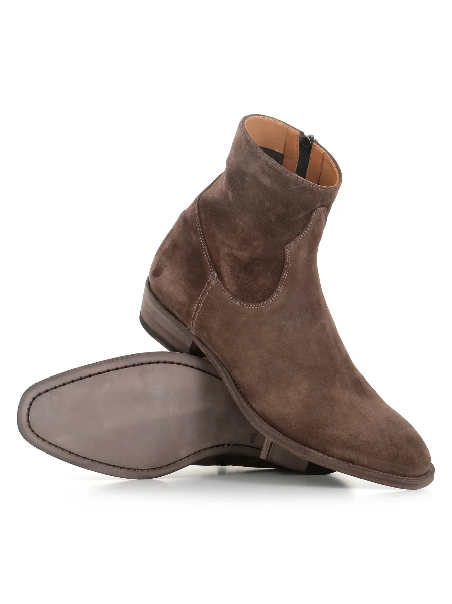 Stivaletto uomo Alberto Fasciani colore testa di moro, realizzato in camoscio, caratterizzato da una punta affusolata e chiusura con zip laterale. Fondo in cuoio. Interno semi foderato. Tacco: 3,5 cm