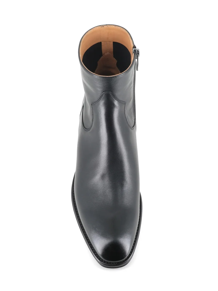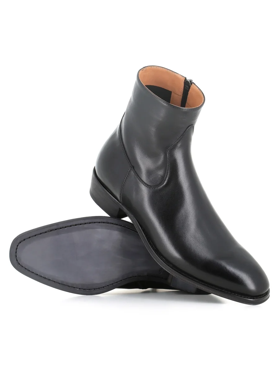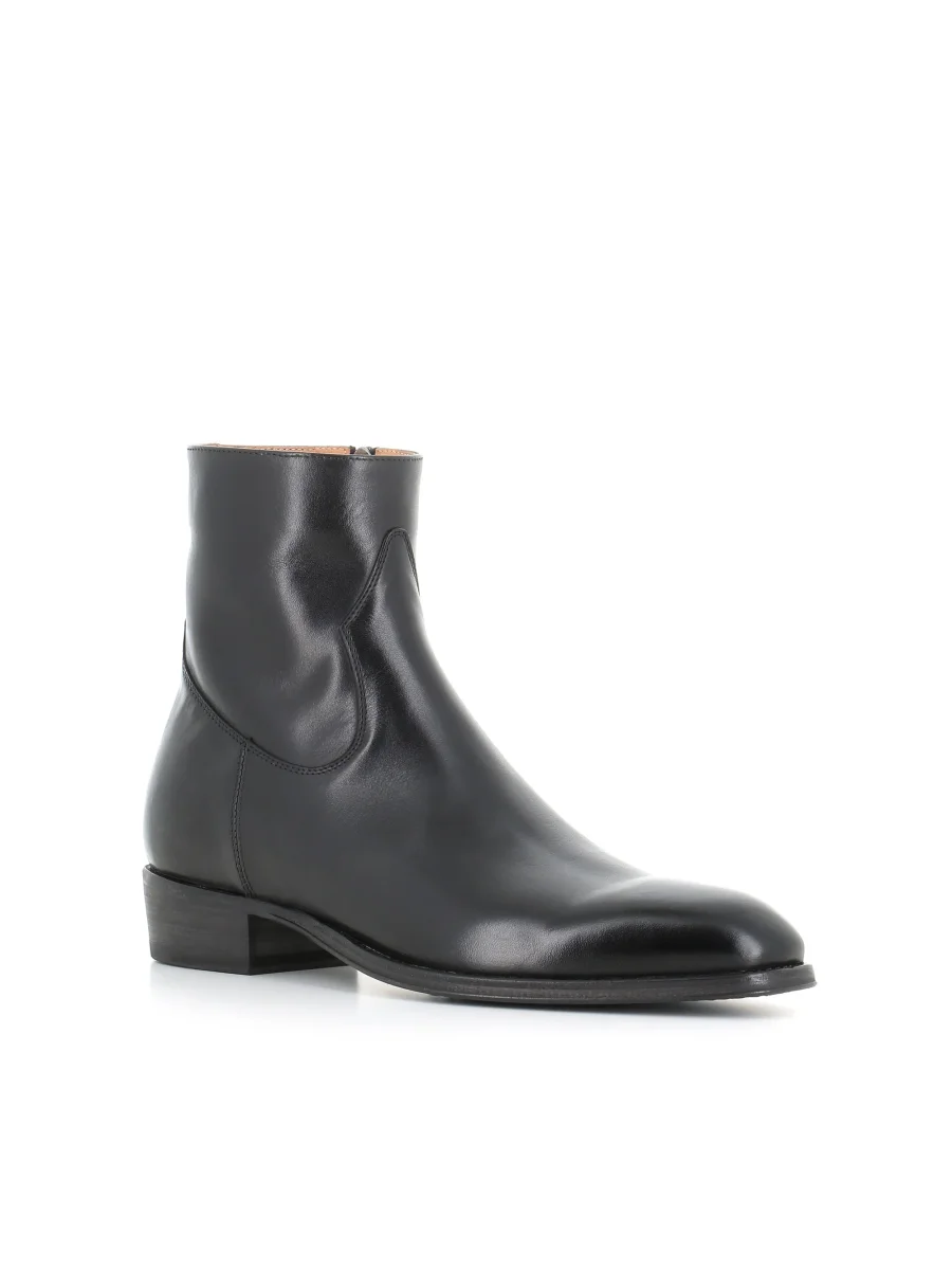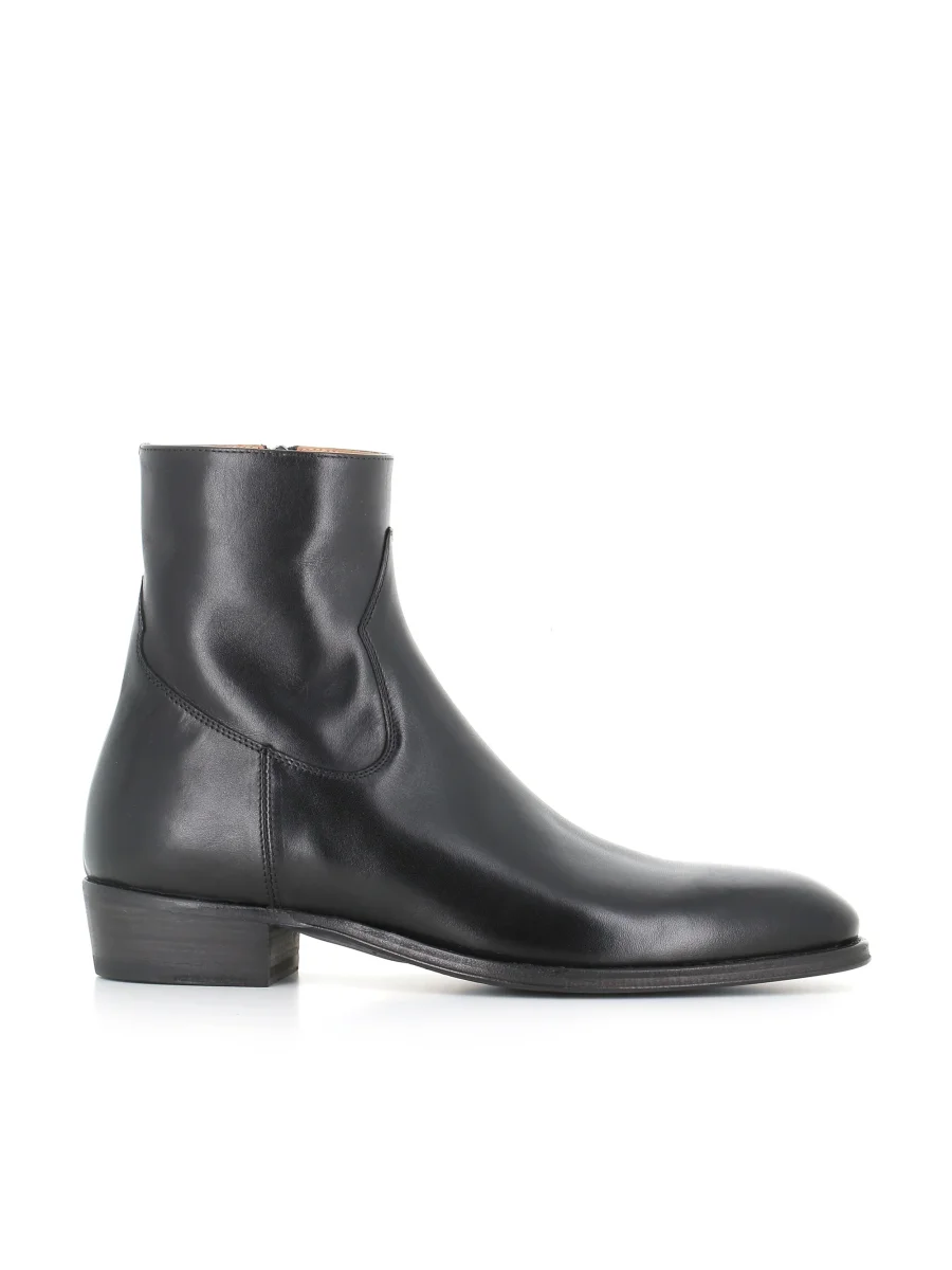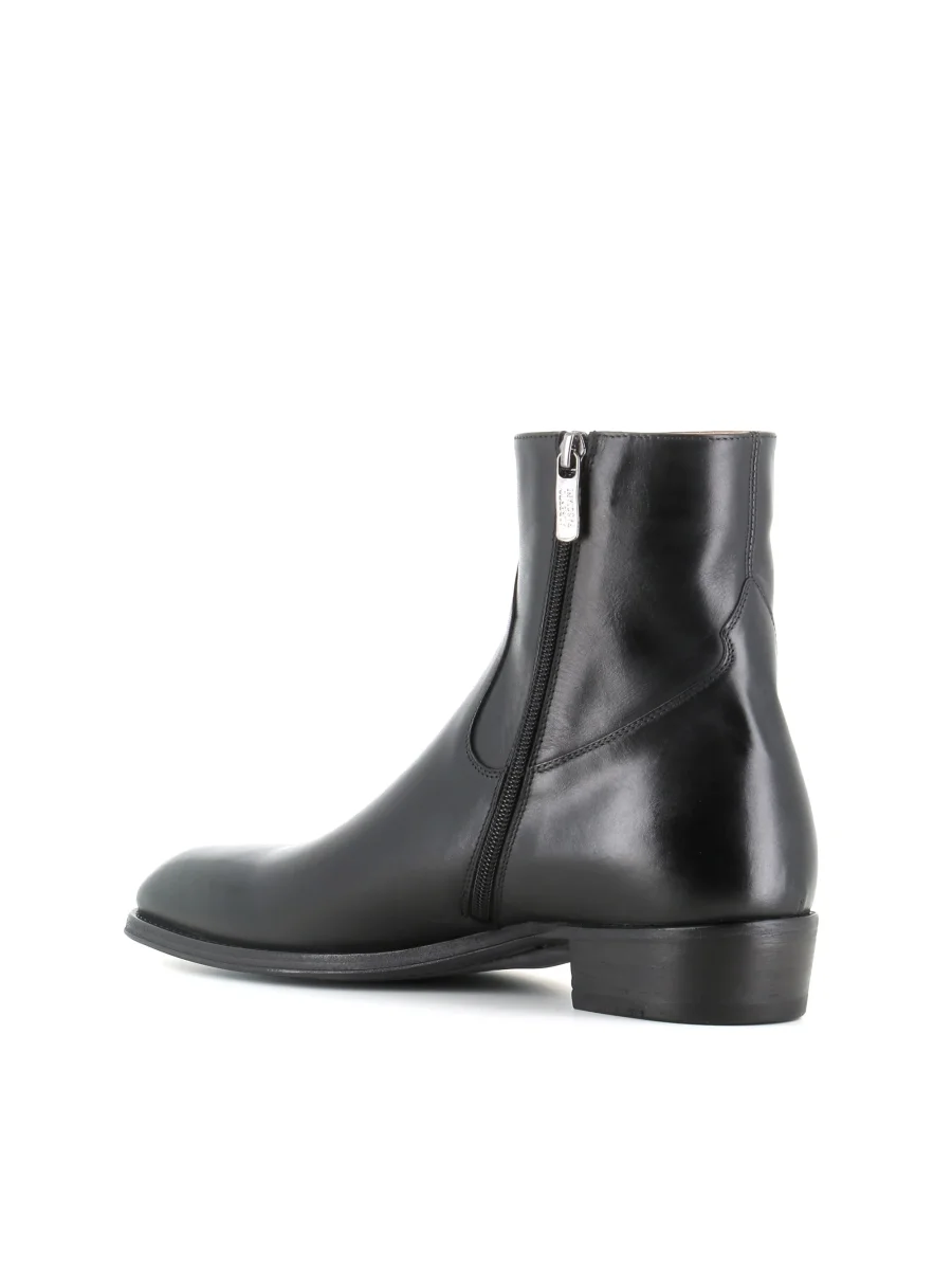 Stivaletto uomo Alberto Fasciani colore nero, realizzato in pelle, caratterizzato da una punta affusolata e chiusura con zip laterale. Lucidato interamente a mano. Fondo in cuoio. Interno semi foderato. Tacco: 3,5 cm