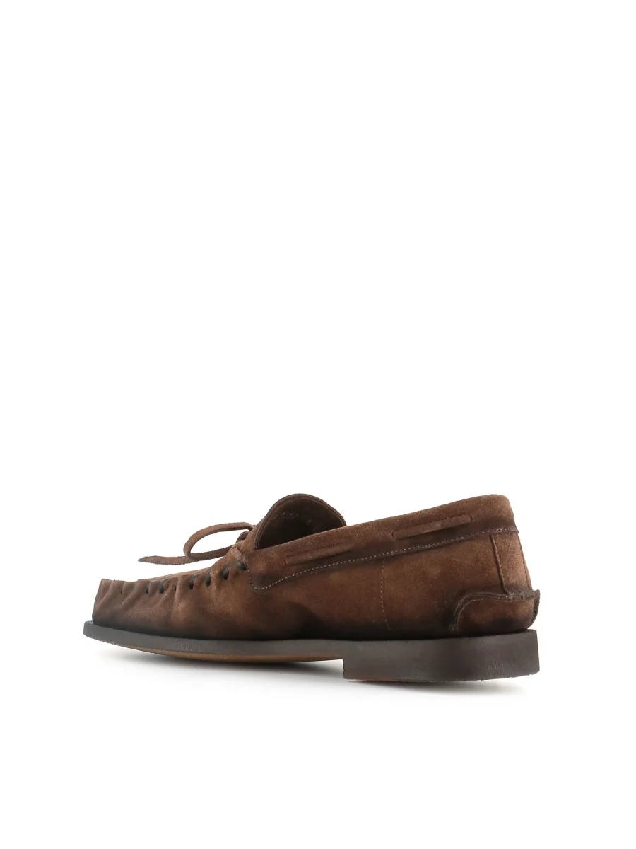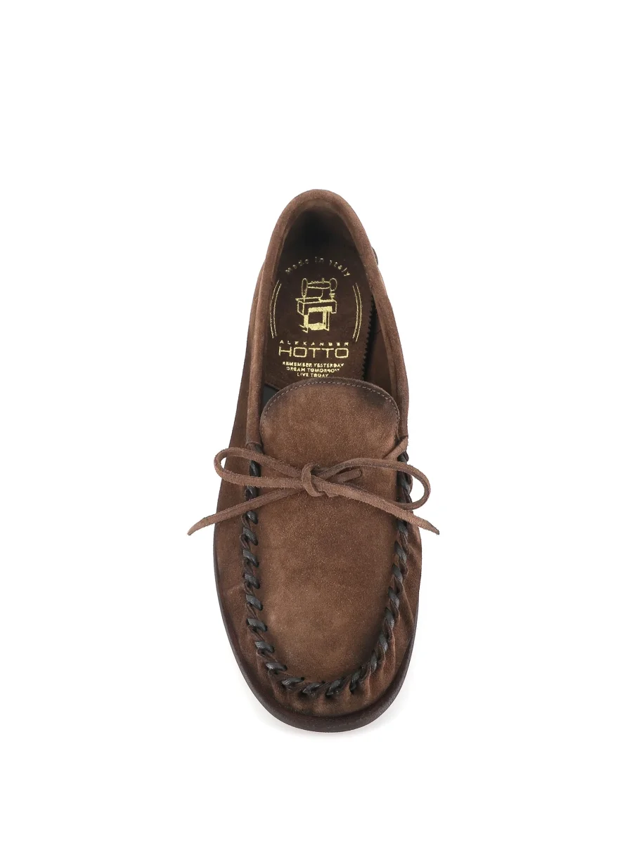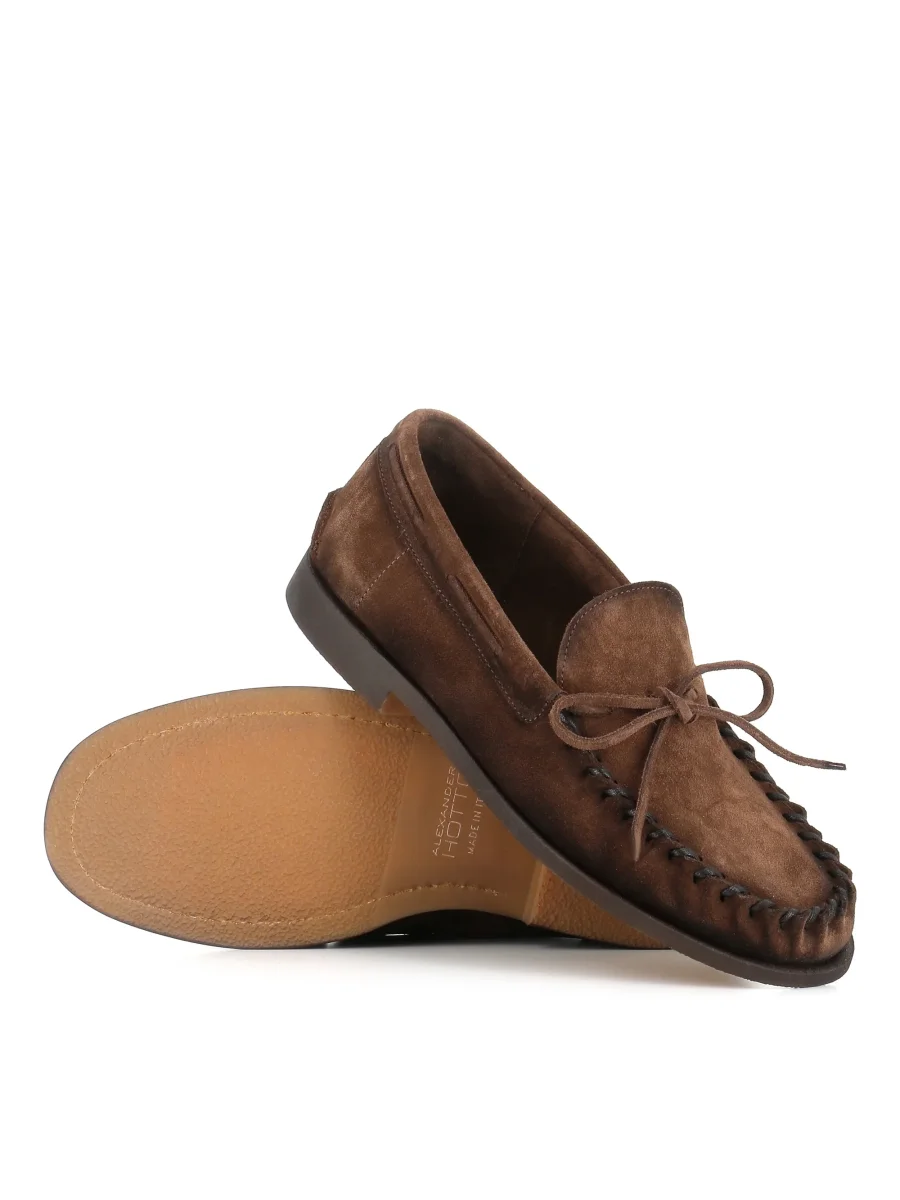 Mocassino uomo Alexander Hotto colore marrone, realizzato in camoscio, caratterizzato da un fiocco decorativo e da cuciture a vista. Interno foderato. Lavorazione artigianale. Rialzo interno di 1,5 cm. Fondo flessibile in gomma. Tacco: 2 cm