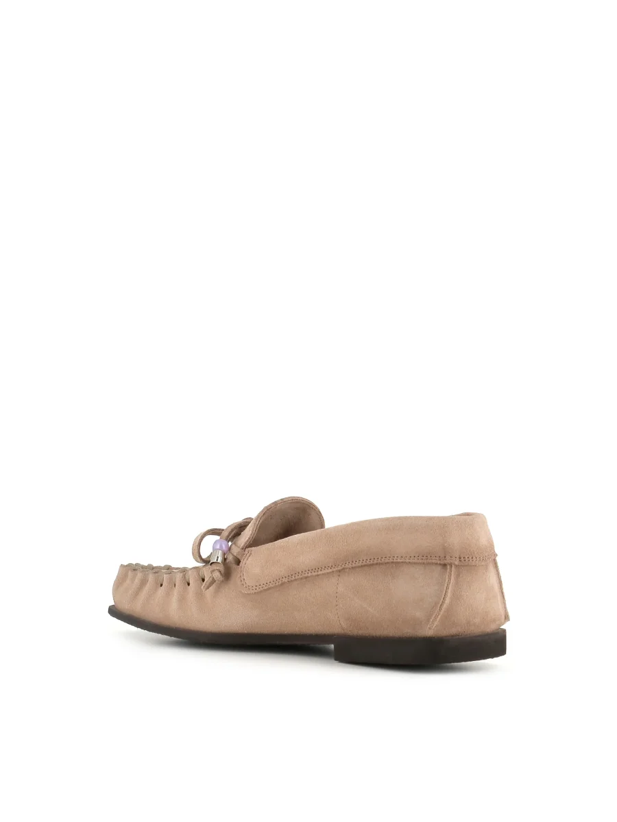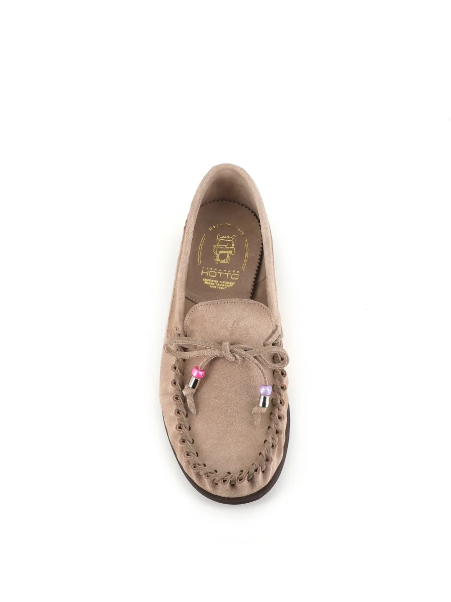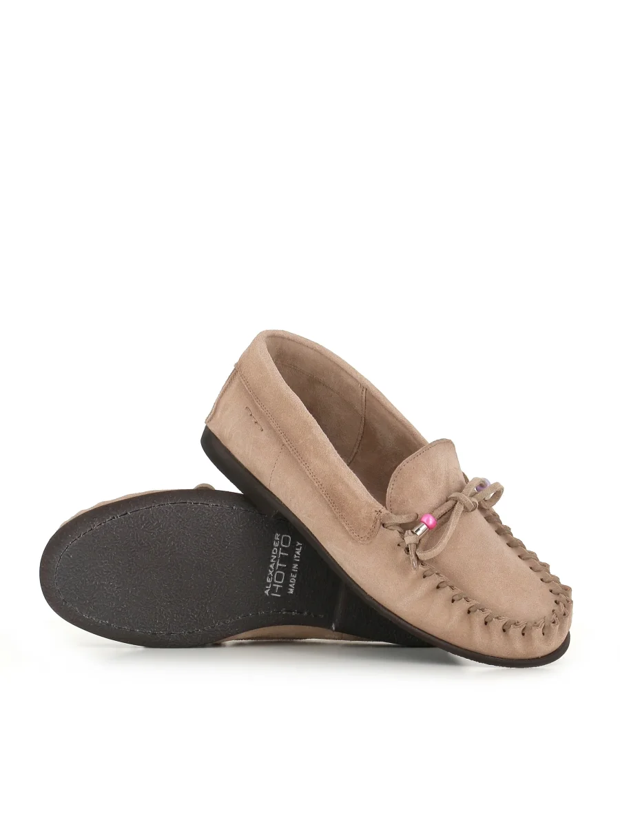 Mocassino donna Alexander Hotto colore beige, realizzato in camoscio, caratterizzato da un fiocco decorativo e da cuciture a vista. Interno foderato. Lavorazione artigianale. Rialzo interno di 1,5 cm. Fondo flessibile in gomma. Tacco: 2 cm