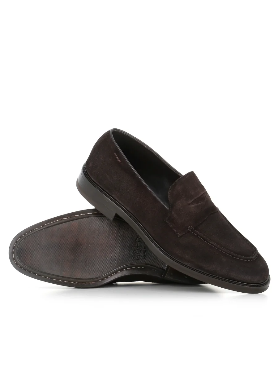 Mocassino uomo Alexander Hotto color testa di moro, realizzato in camoscio, caratterizzato da una punta affusolata e da cuciture a vista. Interno foderato. Soletta imbottita. Lavorazione artigianale. Fondo flessibile in gomma. Tacco: 2,5 cm