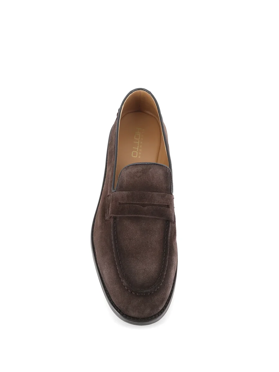 Mocassino uomo di Alexander Hotto color testa di moro, realizzato in camoscio. Interno foderato. Fondo flessibile in gomma. Lavorazione artigianale. Tacco: 2,5 cm