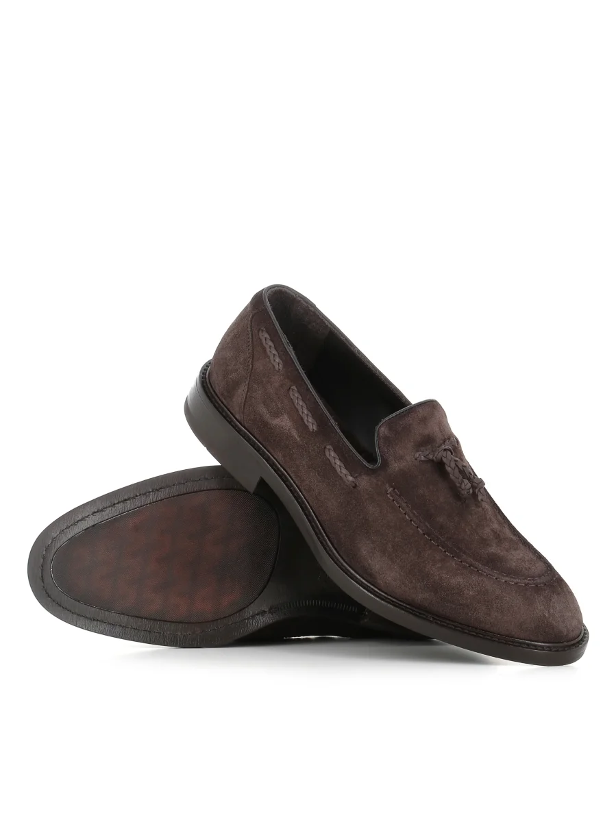 Mocassino con nappe uomo Alexander Hotto marrone, realizzato in camoscio, caratterizzato da fiocchi decorativi, da una punta affusolata e da una soletta interna imbottita. Interno foderato. Fondo in cuoio con suola in gomma. Tacco: 3 cm