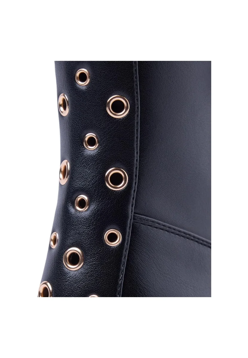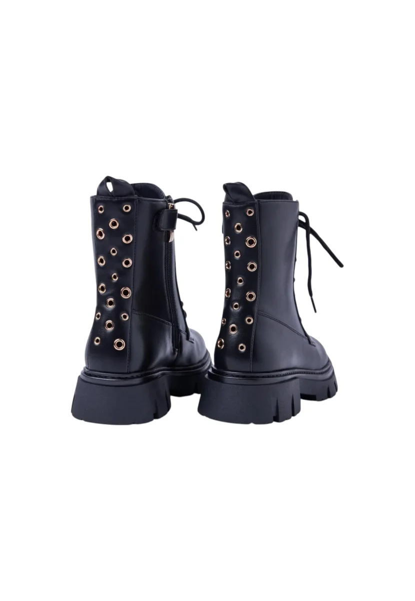 Questi Stivali con occhielli sul retro del gambale sono caratterizzati da tomaia in poliuretano e fodera in poliuretano e poliestere, soletta in pelle imbottita, รจ prevista chiusura con laccio e cerniera laterale, suola in gomma stile track.