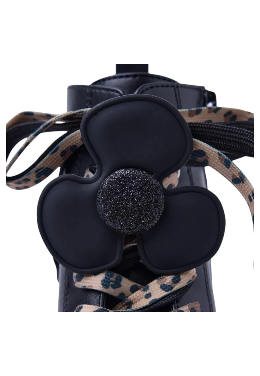 Questi stivali glitterati con fiore removibile sono caratterizzati da tomaia in poliuretano, poliestere e glitter e fodera traspirante in poliuretano e poliestere, soletta in poliestere imbottata, รจ prevista chiusura con cerniera laterale, suola in gomma stile track.