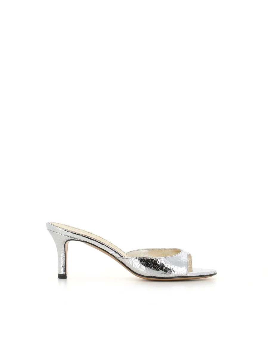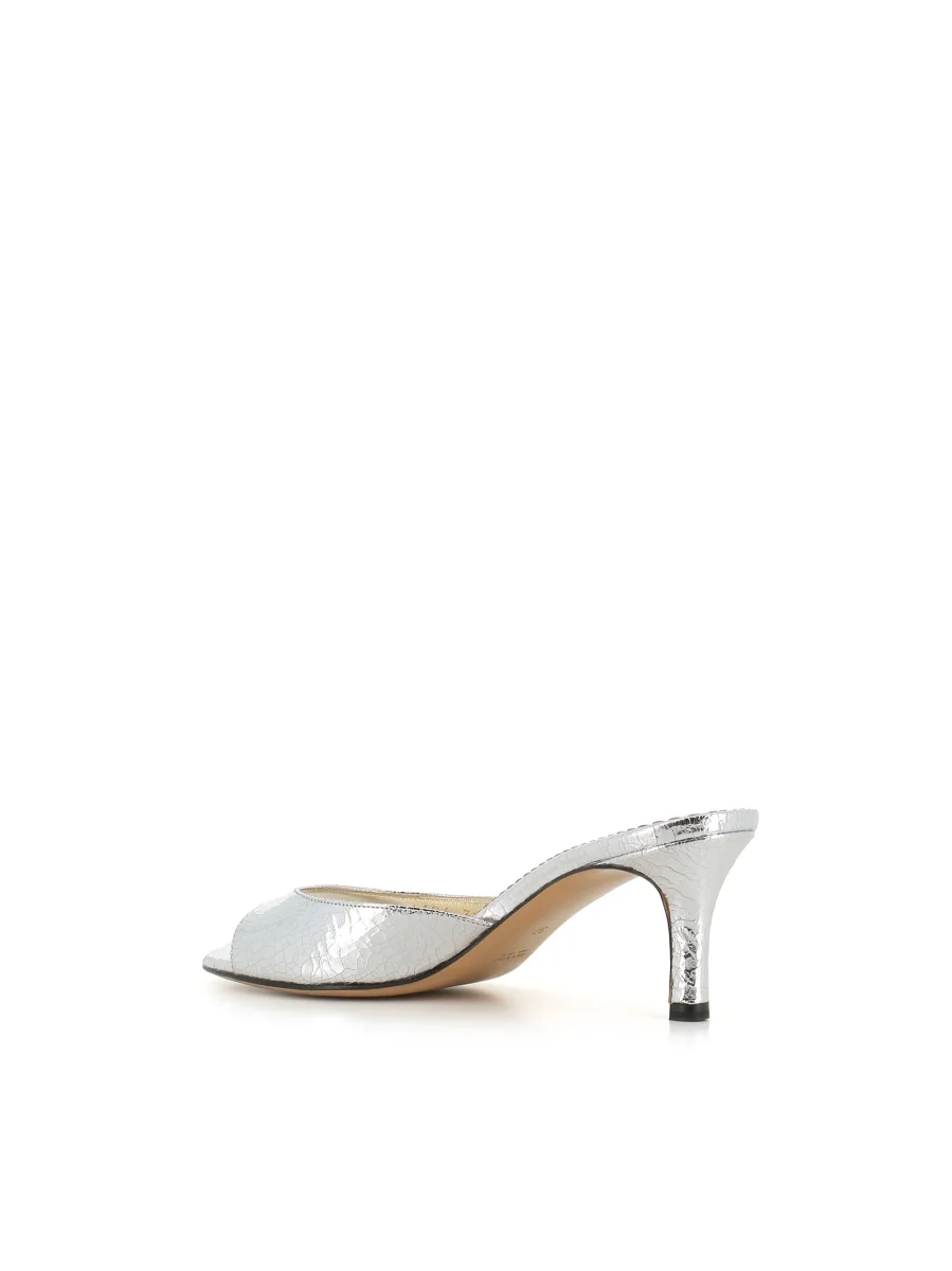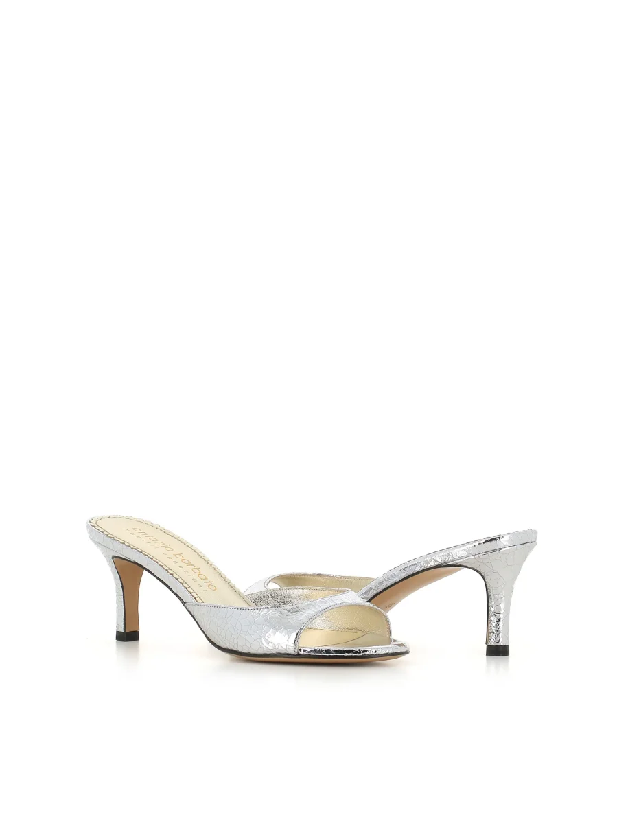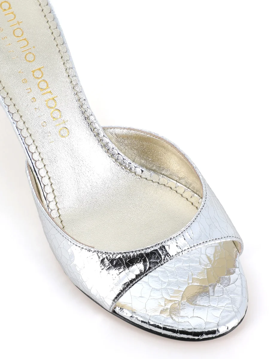 Sandalo donna Antonio Barbato Maestri Veneziani color argento, realizzato in pelle effetto craquelè. Suola in cuoio. Interno foderato. Tacco: 6 cm