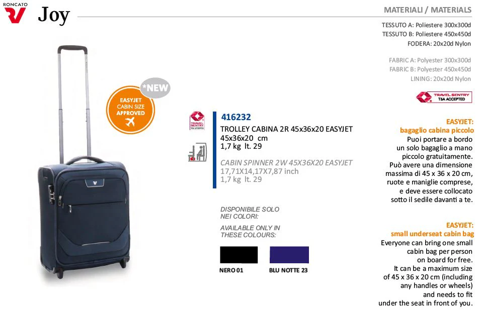 Bagaglio Cabina Gratuito a Bordo EASY JET 45x36x20 cm jOY Roncato Blu 2 RUOTE