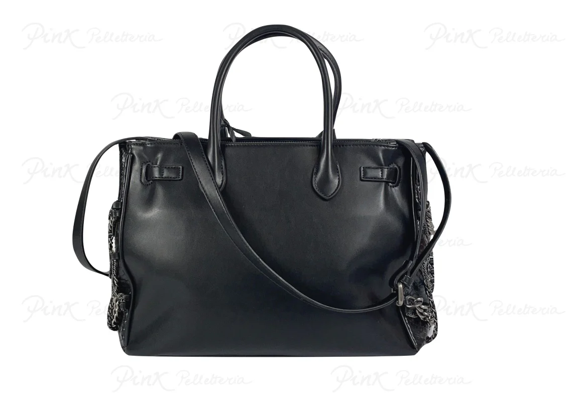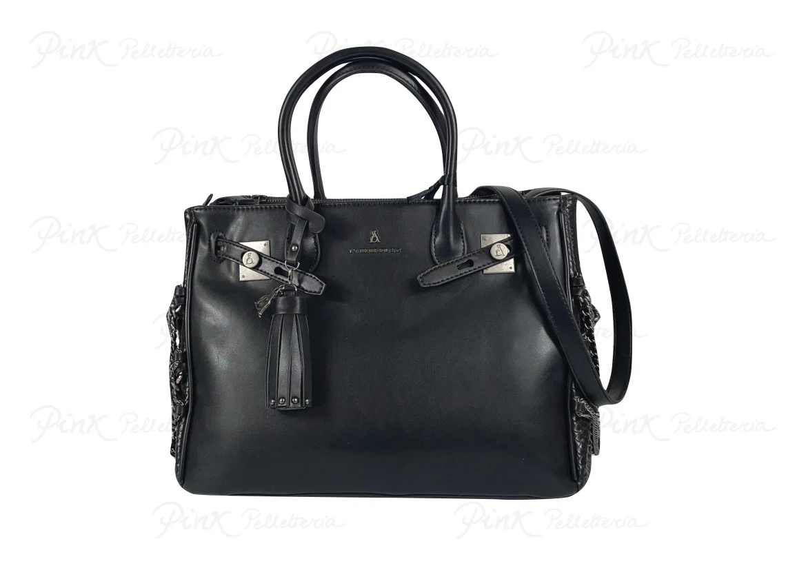 Borsa in ecopelle con due manici e tracolla regolabile. Motivo catene laterale, chiusura con gancio e zip.