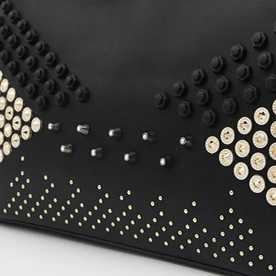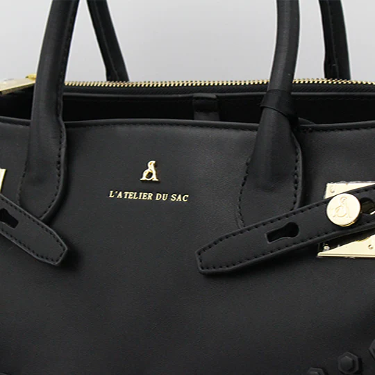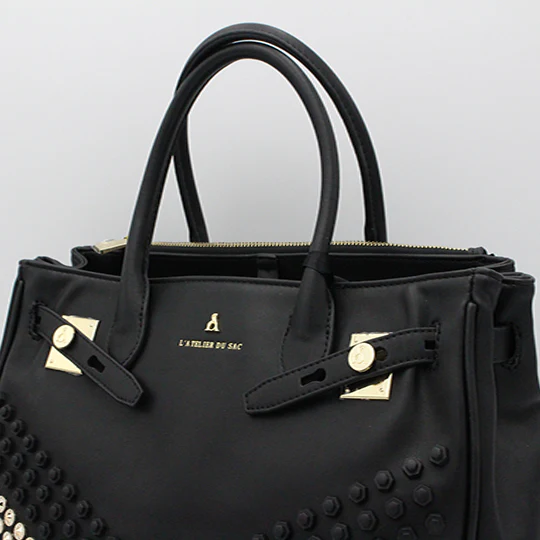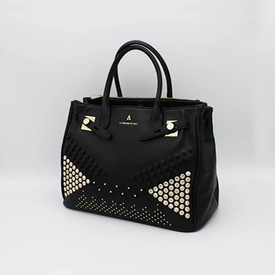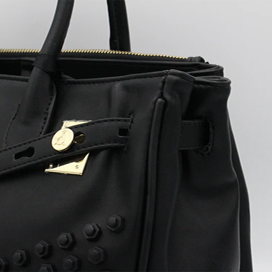 Borsa donna in ecopelle con manici rigidi, chiusura e accessori applicati sull’esterno.