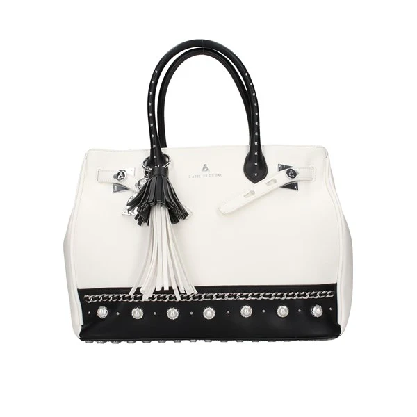Borsa a mano in eco-pelle firmata Atelier du Sac, capiente e molto femminile, perfetta per la città. Design reso unico dalle borchie e catena. Dotata di tracolla regolabile.