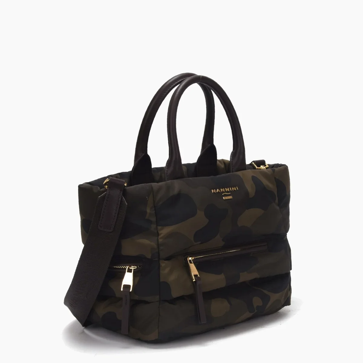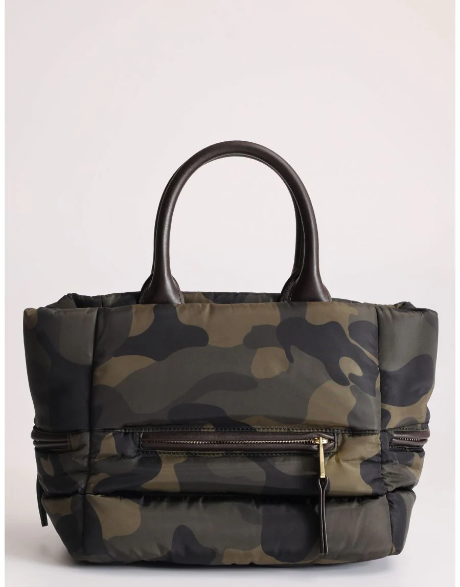 Super trendy Bauletto in tessuto piumino fantasia militare, multi tasca con tracolla regolabile removibile.