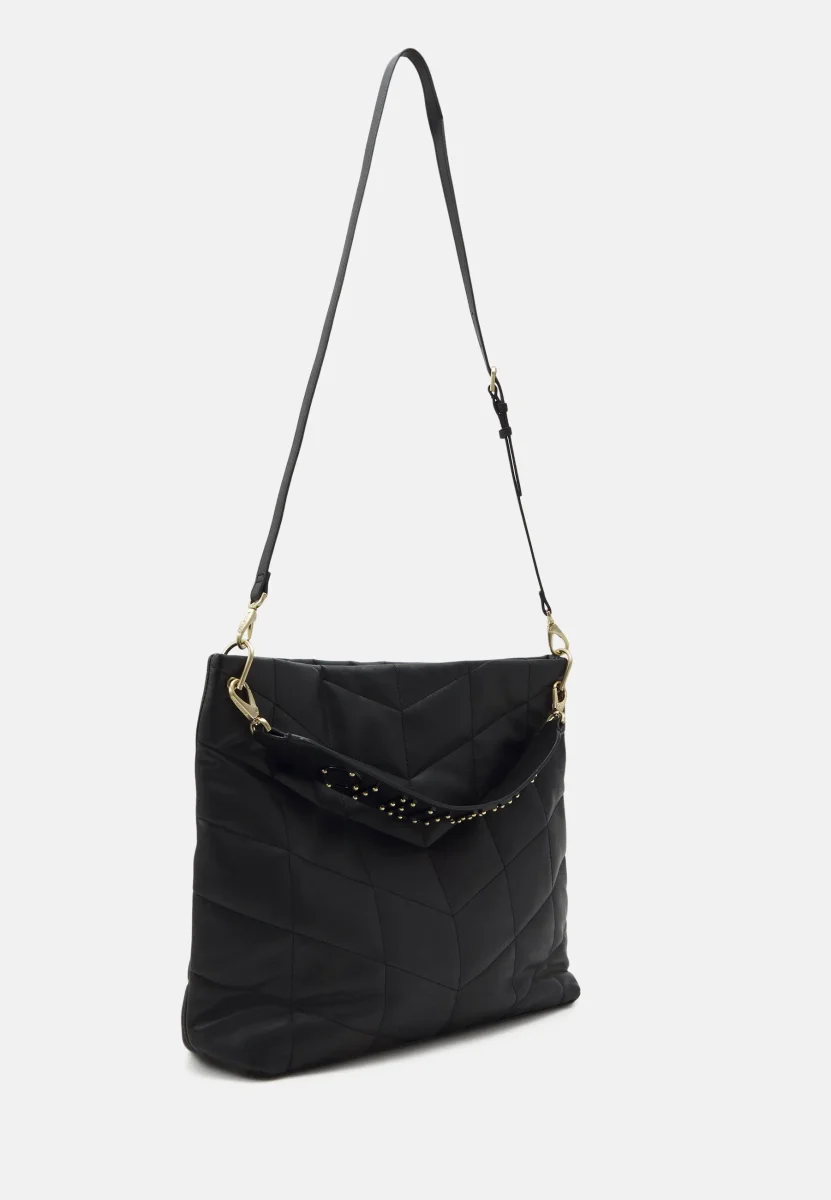 Morbida borsa con disegno metalasse che può essere portata a spalla corta, grazie alla tracolla siglata o a tracolla.