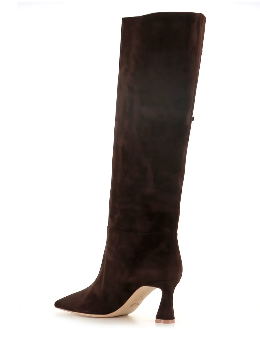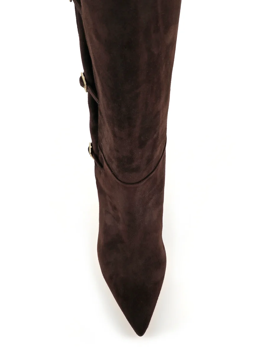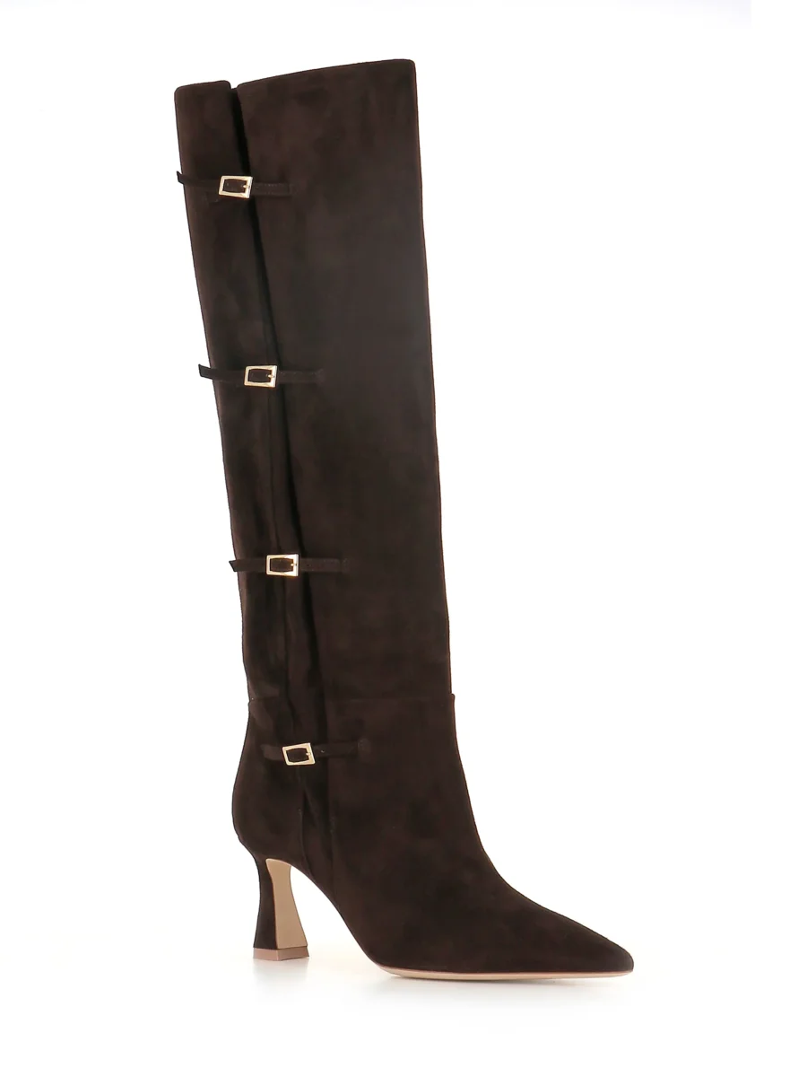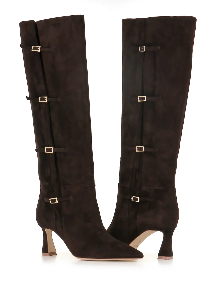 Stivale donna Malone Souliers color ebano, realizzato in morbido camoscio, caratterizzato da quattro fibbie laterali dorate. Suola in cuoio. Interno foderato. Tacco: 7 cm