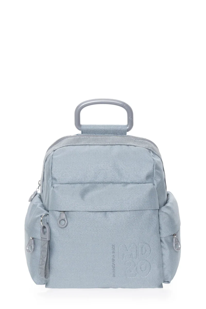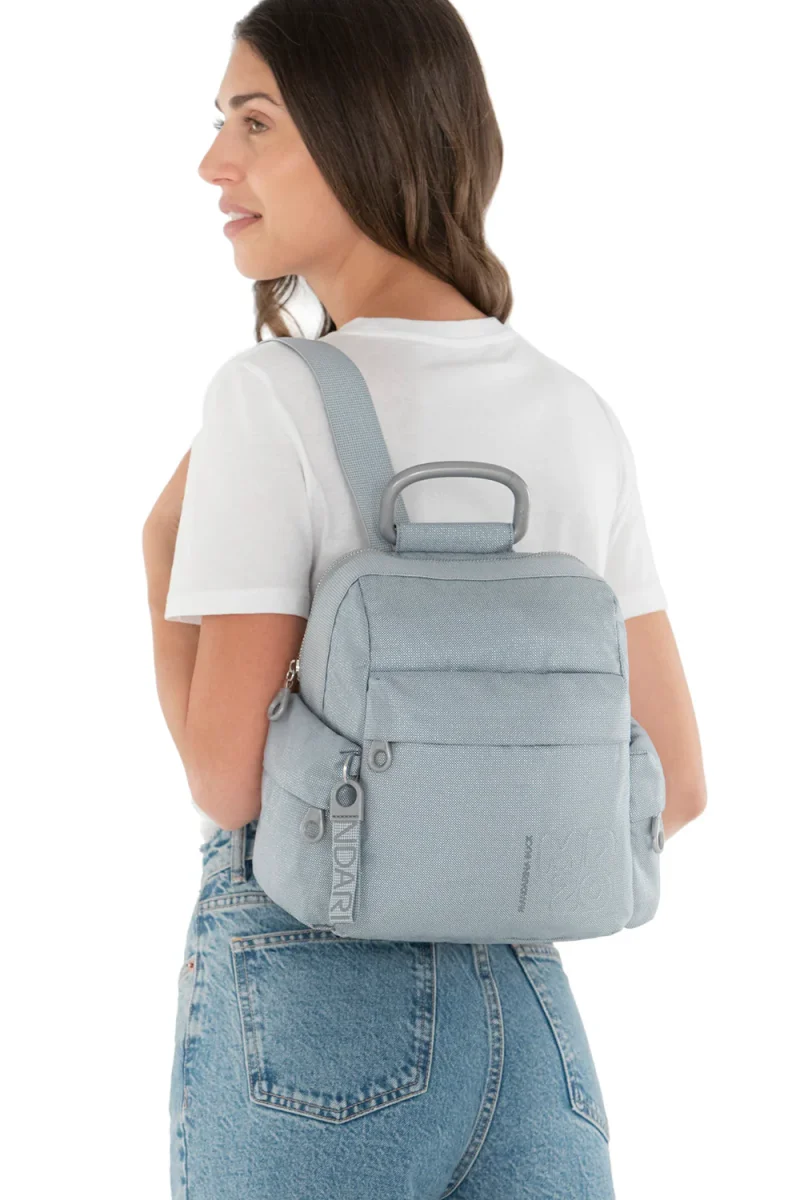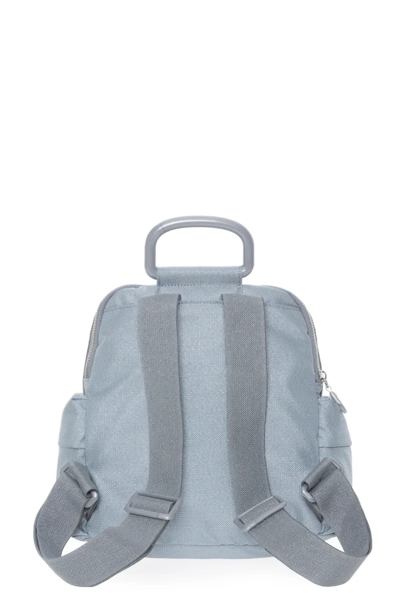 Zaino di piccole dimensioni in mitrix, storico materiale del marchio Mandarina Duck. Leggero, versatile e connotato da un originale effetto cangiante. Il tessuto è reso brillante dal filo iridescente intrecciato al tessuto dai colori più scuri e contrastati. Gli spallacci regolabili uniti alle tasche zippate interne ed esterne rendono lo zaino comodo e funzionale.
