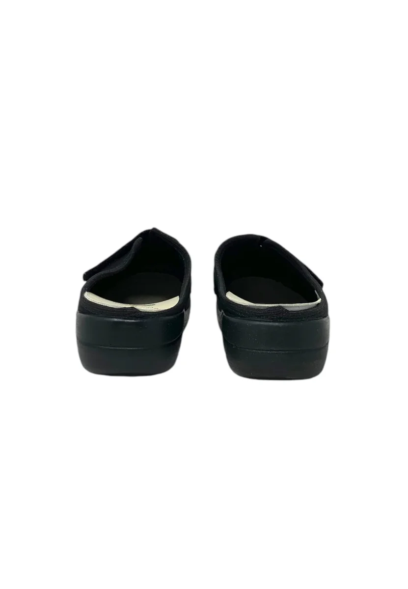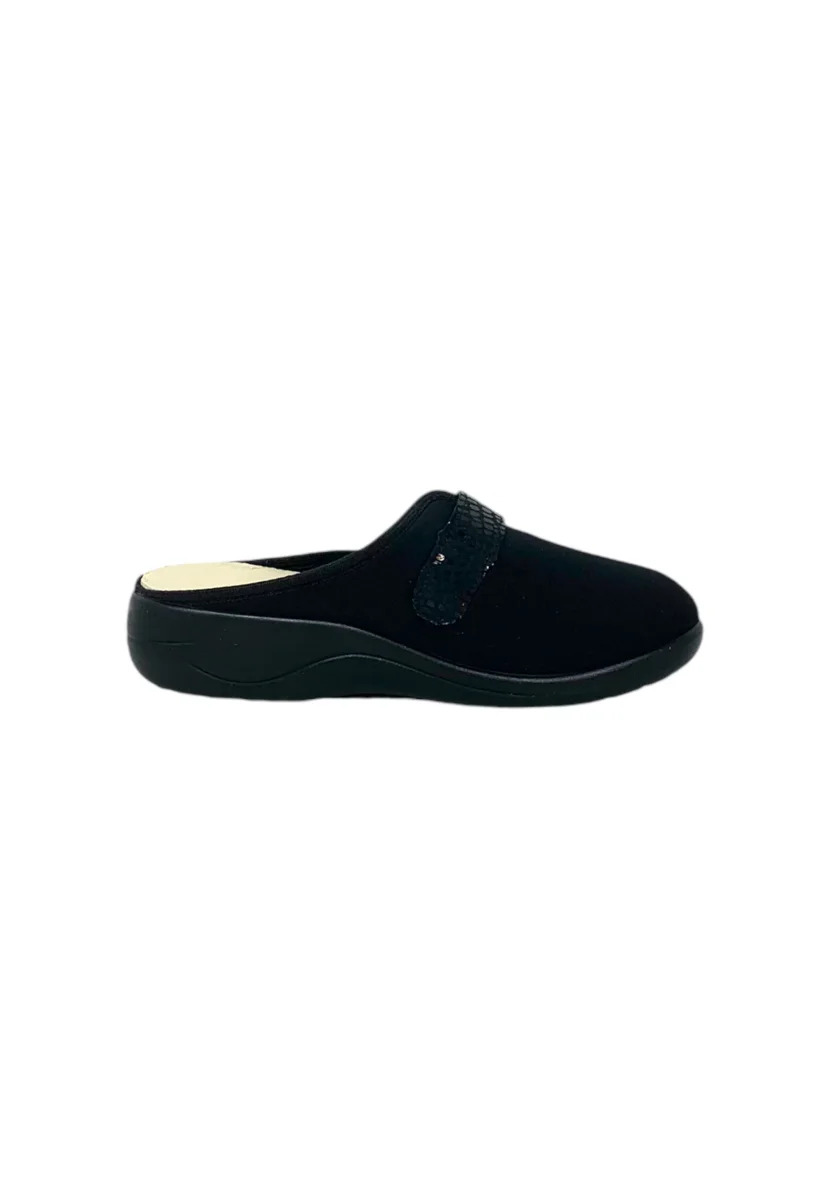 Le pantofole sono caratterizzate da un materiale esterno in tessuto, una fodera in morbido tessuto, sottopiede anatomico in vera pelle, suola in sintetico, zeppa alta circa 4 cm circa, fascia regolabile con strappo.