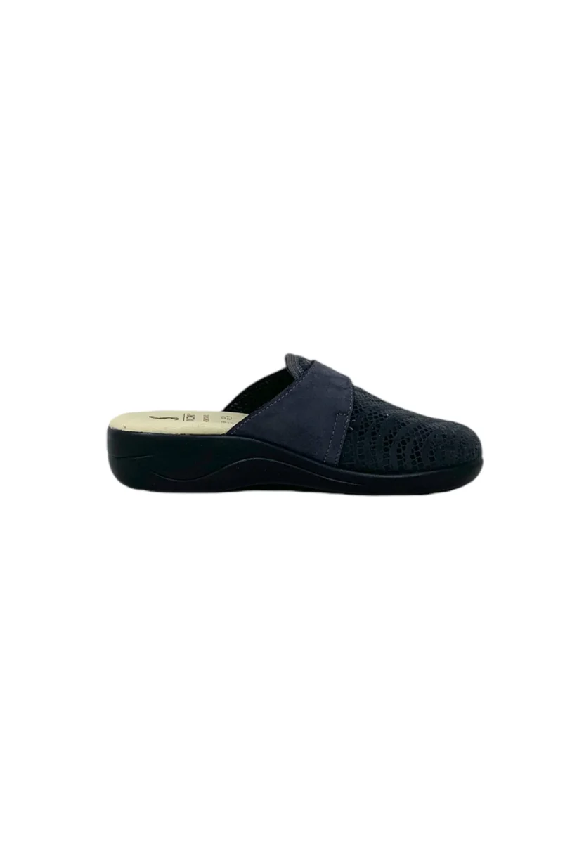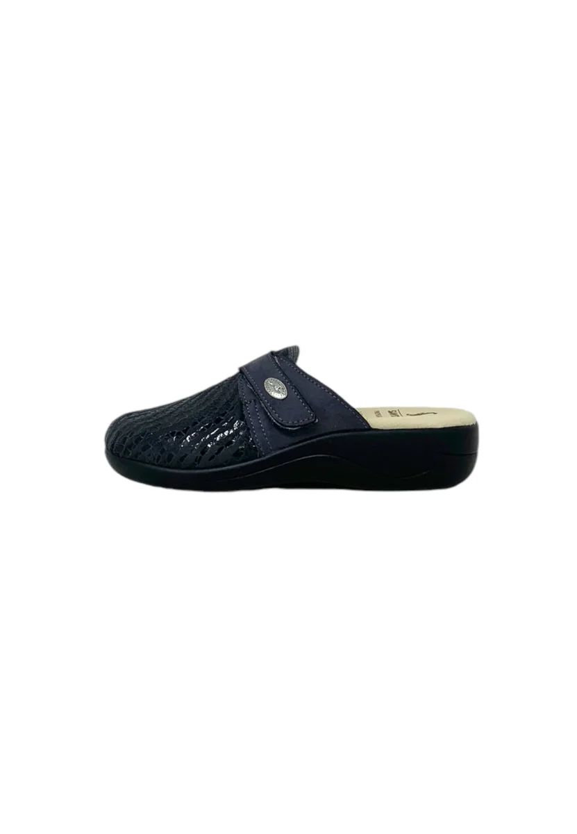 Le pantofole sono caratterizzate da un materiale esterno in sintetico, una fodera in morbido tessuto, sottopiede anatomico in vera pelle, suola in sintetico, zeppa alta circa 4 cm circa, fascia regolabile con strappo.