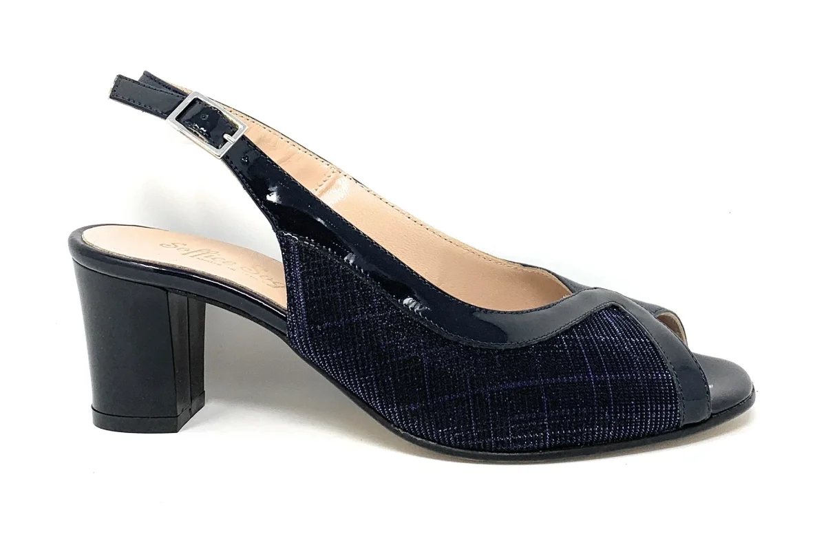 Sandalo in pelle nappata e tessuto glitter con inserto, cinturino in pelle effetto vernice, cinturino regolabile con fibbia, fodera e sottopiede in pelle, suola in vero cuoio, tacco laccato altezza cm 6.