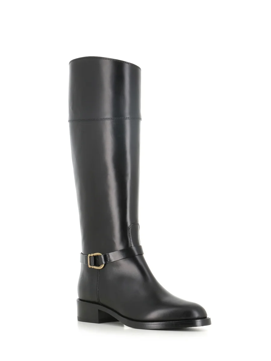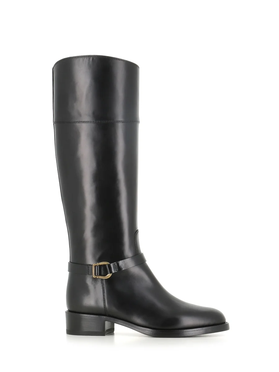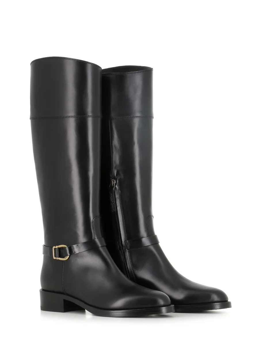 Stivale donna Sartore colore nero, realizzato in pelle spazzolata, caratterizzato da una punta affusolata e da una chiusura con zip laterale e fibbia. Suola in cuoio. Interno fodetato. Tacco: 3,5 cm