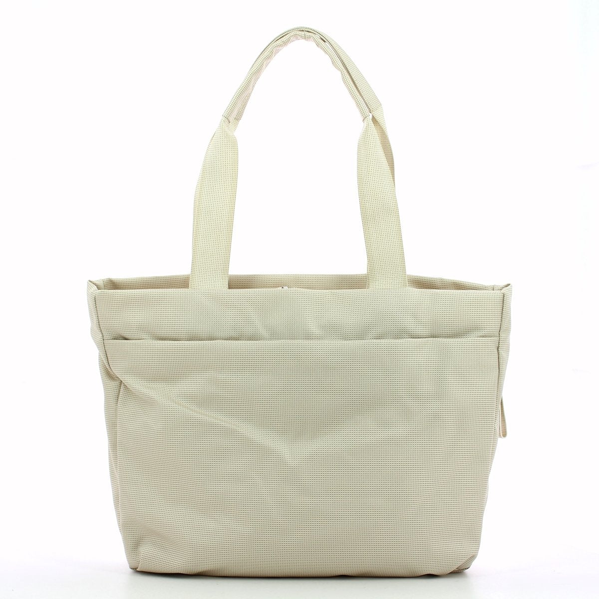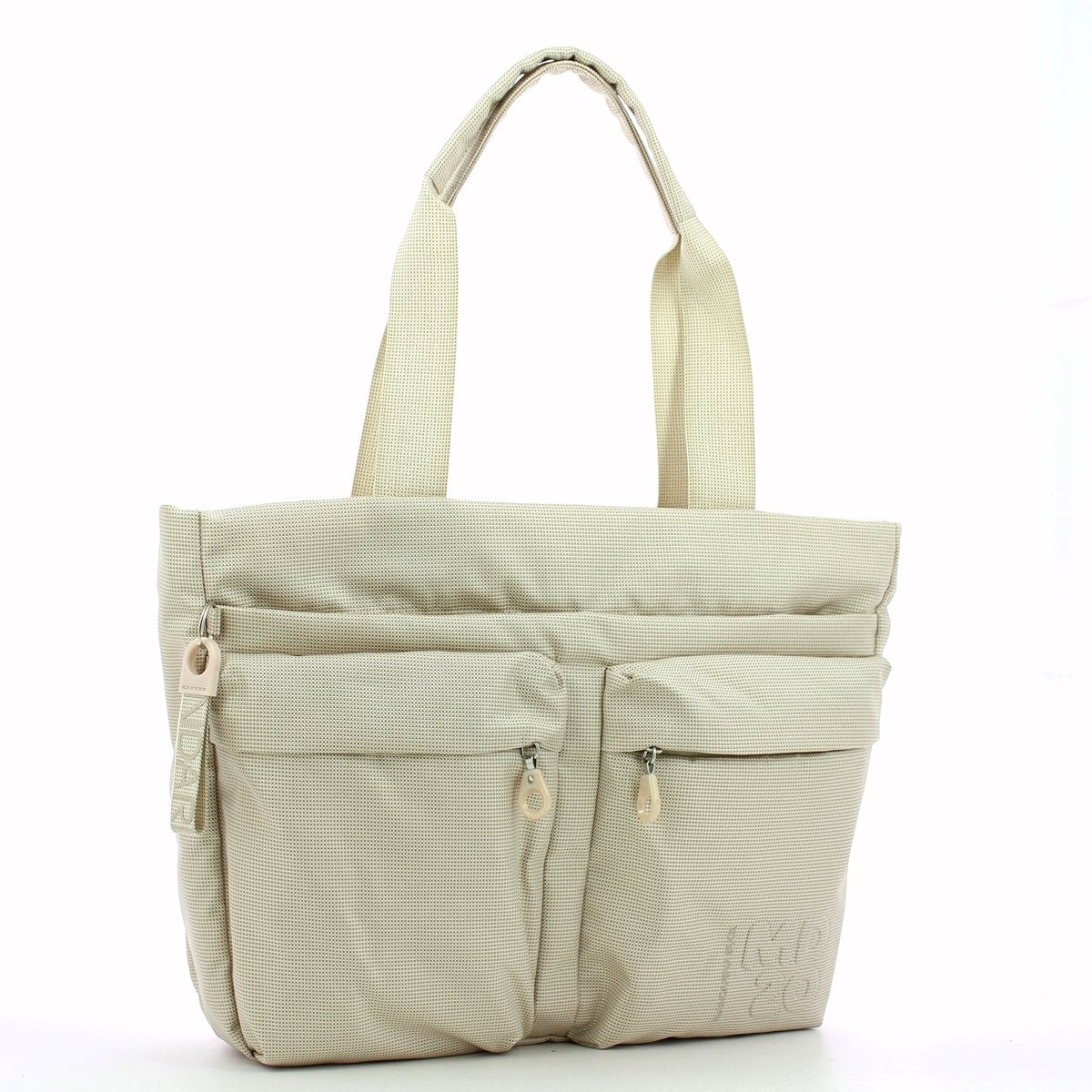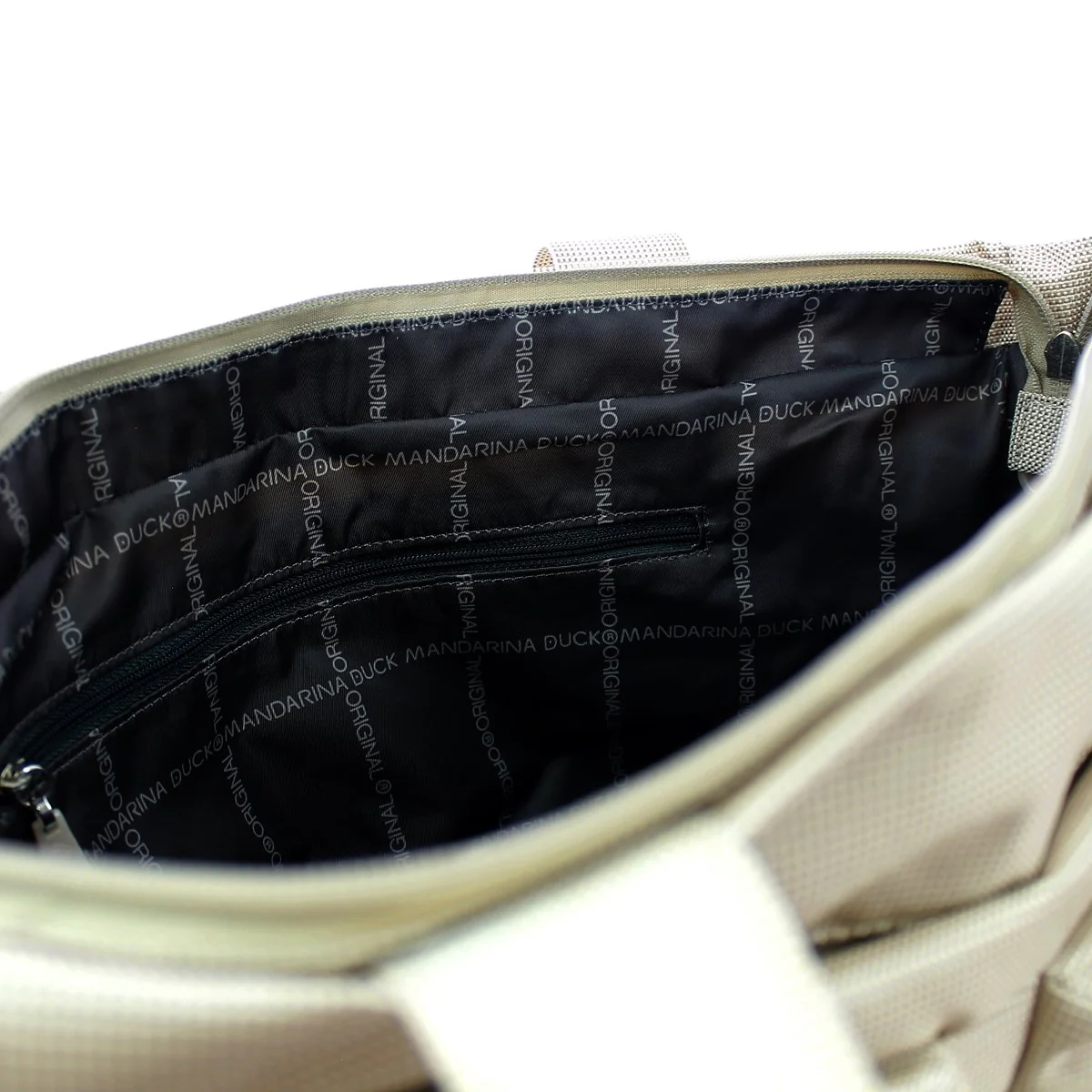 Shopper MD20 Mandarina Duck, ampia e comoda borsa a spalla in tessuto, con doppi manici, tasche frontali con zip, tasca posteriore e comparto principale con cerniera, interno foderato e taschini.