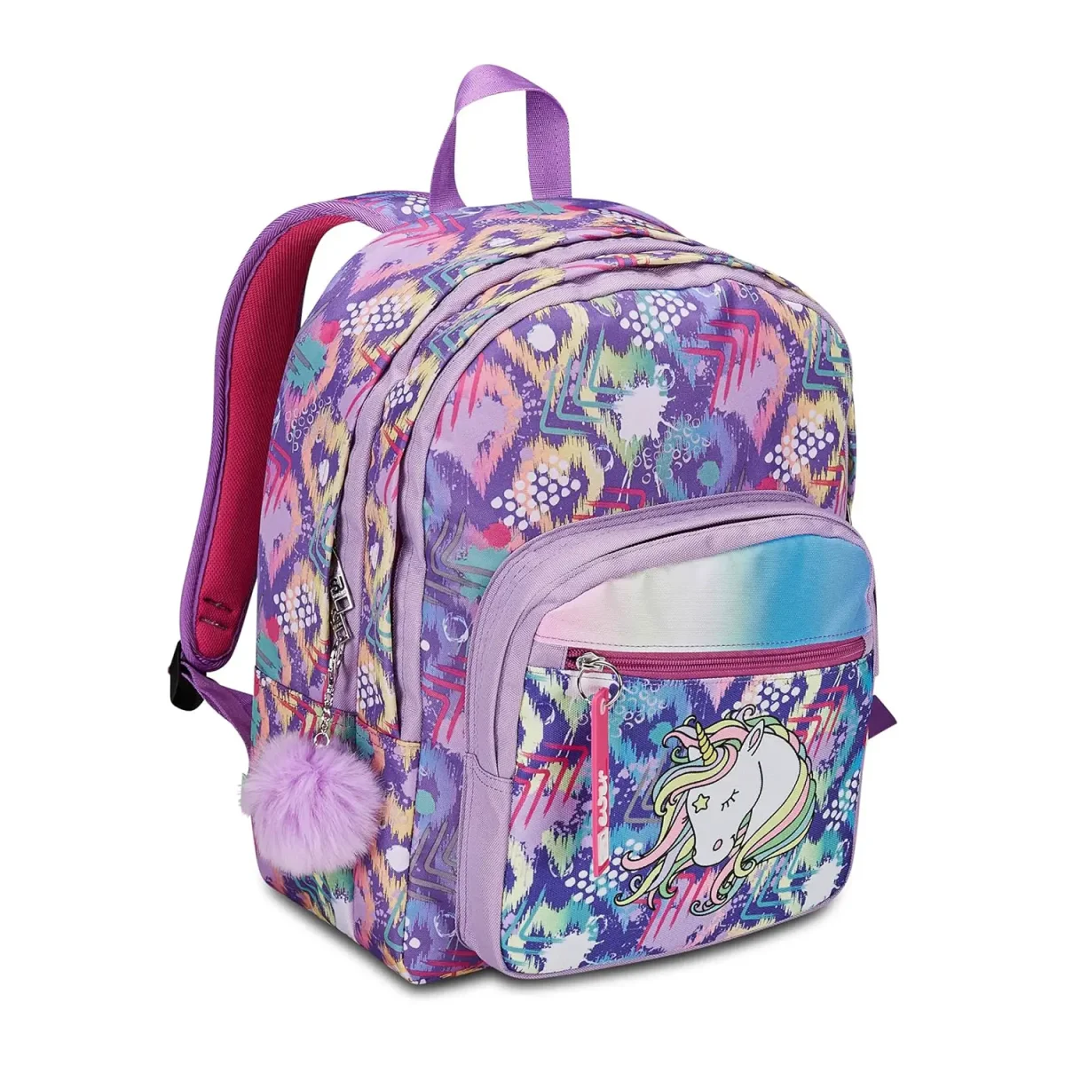 Vivaci unicorni danzano tra colori brillanti su uno sfondo viola, rendendo questo zaino un must-have per i fan del fantastico.