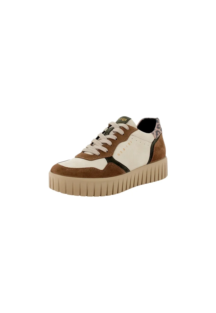 Le Sneakers sono costituite completamente con materiali riciclati. Sono caratterizzate da un materiale esterno in pelle sintetica, fodera in tessuto, sottopiede in pelle, suola in gomma sintetica con zeppa alta circa 4 cm.