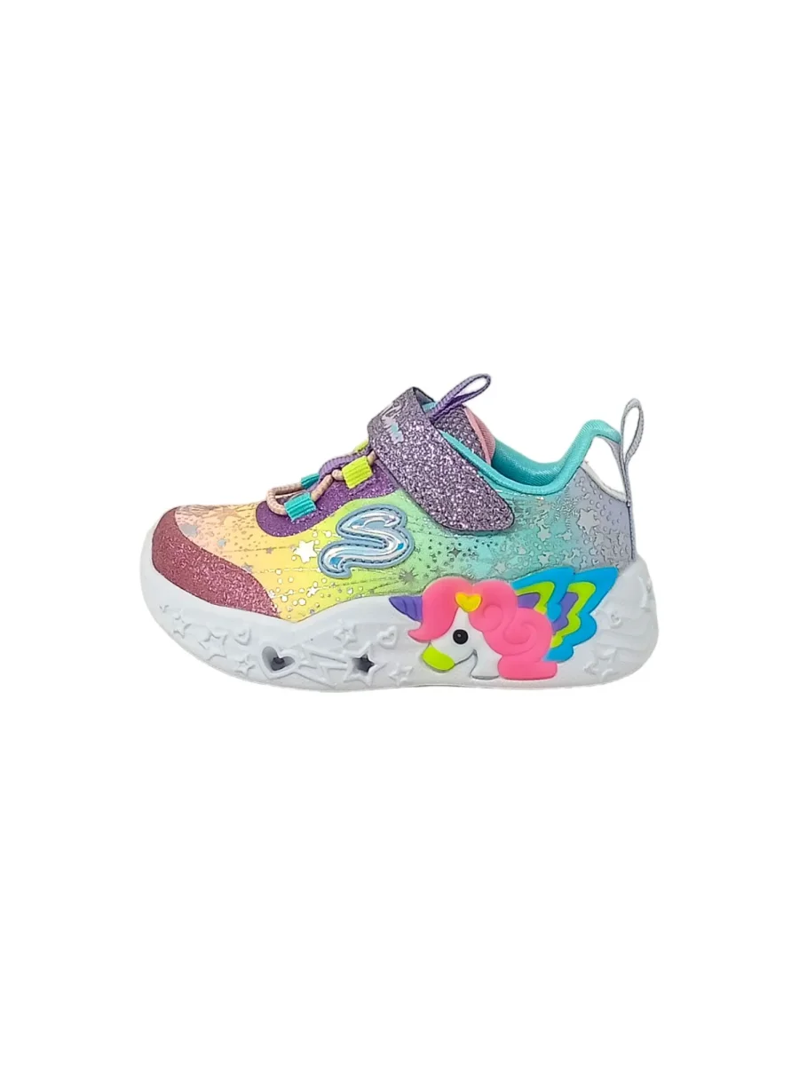 Illumina la tua giornata con un poโ di magia di unicorno indossando le sneaker Skechers S-Lights: Unicorn Charmer: Twilight Dream, caratterizzate una luccicante stampa a stelle e applicazioni sintetiche glitterate con unicorno scolpito.