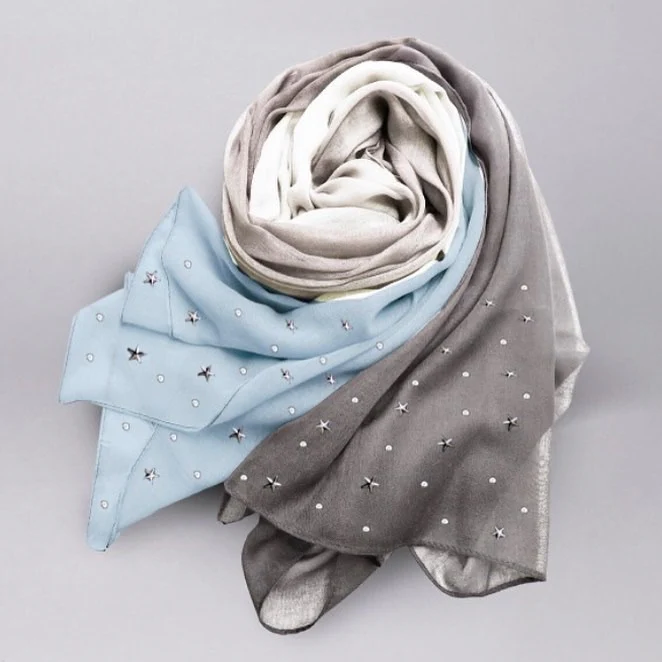 La Pashmina in coordinato è 100% viscosa tinta unita con applicazioni di borchie e stelle come la borsa.