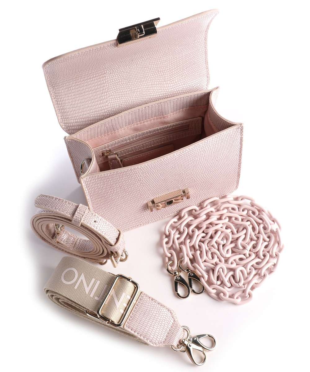 Borsa mini con chiusura metallica personalizzata e verniciata in tono e doppia tracolla staccabile. Una in catena verniciata in tono ed una in nastro personalizzato sempre in tono. Superficie Esterna: ecopelle semilucida Superficie Interna: fodera interna poliestere Modello: Pattina Peso: 700 Altezza: 13 Larghezza: 17 Lunghezza: 7.5