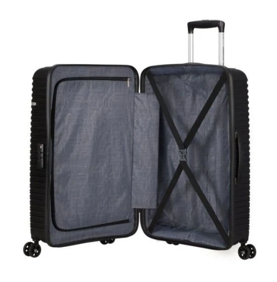 Trolley grande American Tourister Liftoff. Trolley realizzato in robusto Polipropilene ultraleggero, 4 ruote piroettanti gemellari per la massima manovrabilità, carrello di traino telescopico con push botton, chiusura a tripla combinazione con sistema TSA per gli Stati Uniti. Interno completamente foderato con divisorio e nastri per bloccare l’abbigliamento. Garanzia 2 anni.