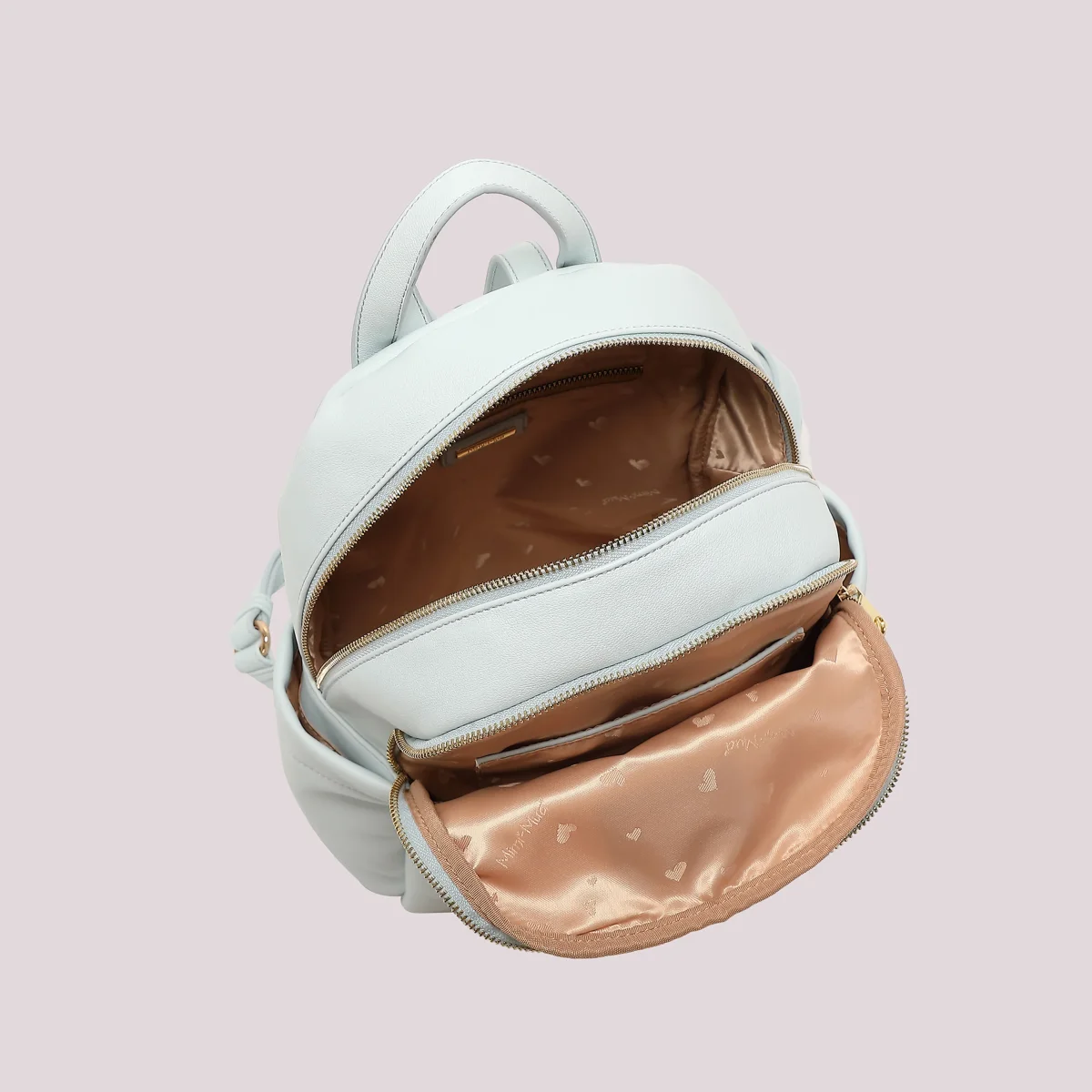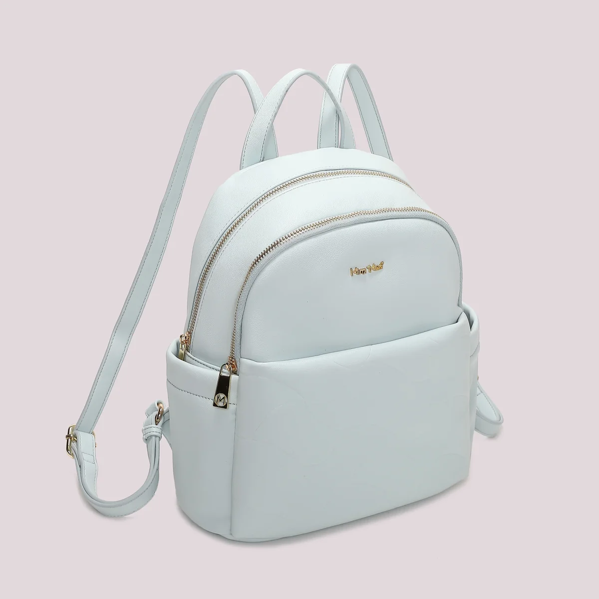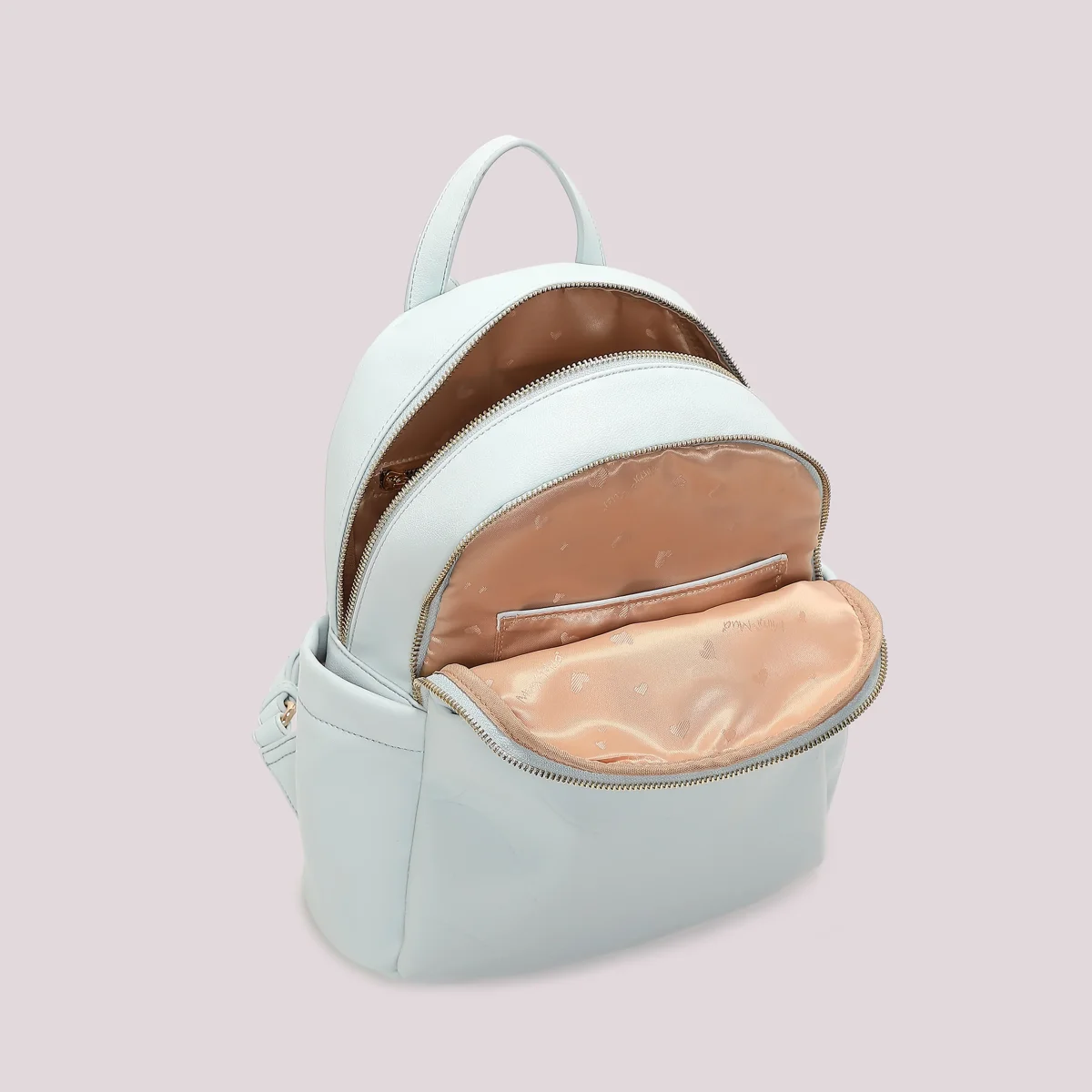 Zaino donna Mimì-Muà. Zaino realizzato in morbido materiale sintetico. Ampia tasca principale chiusa da zip, tasca interna chiusa da zip e tasche per piccoli oggetti. Spallacci regolabili in lunghezza.
