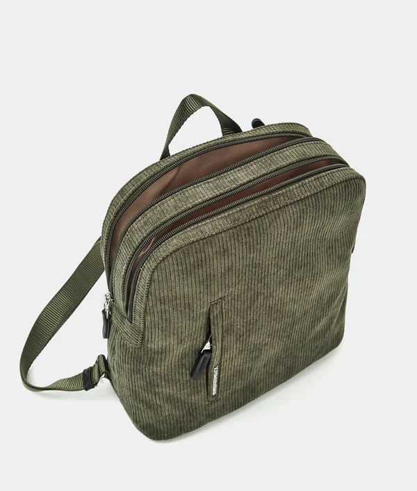 Zaino piccolo doppio scomparto, con tasca frontale piatta, tasca posteriore, con zip in tessuto.