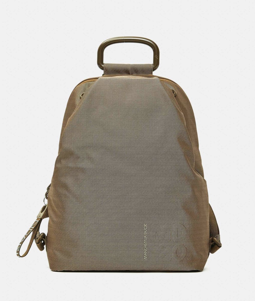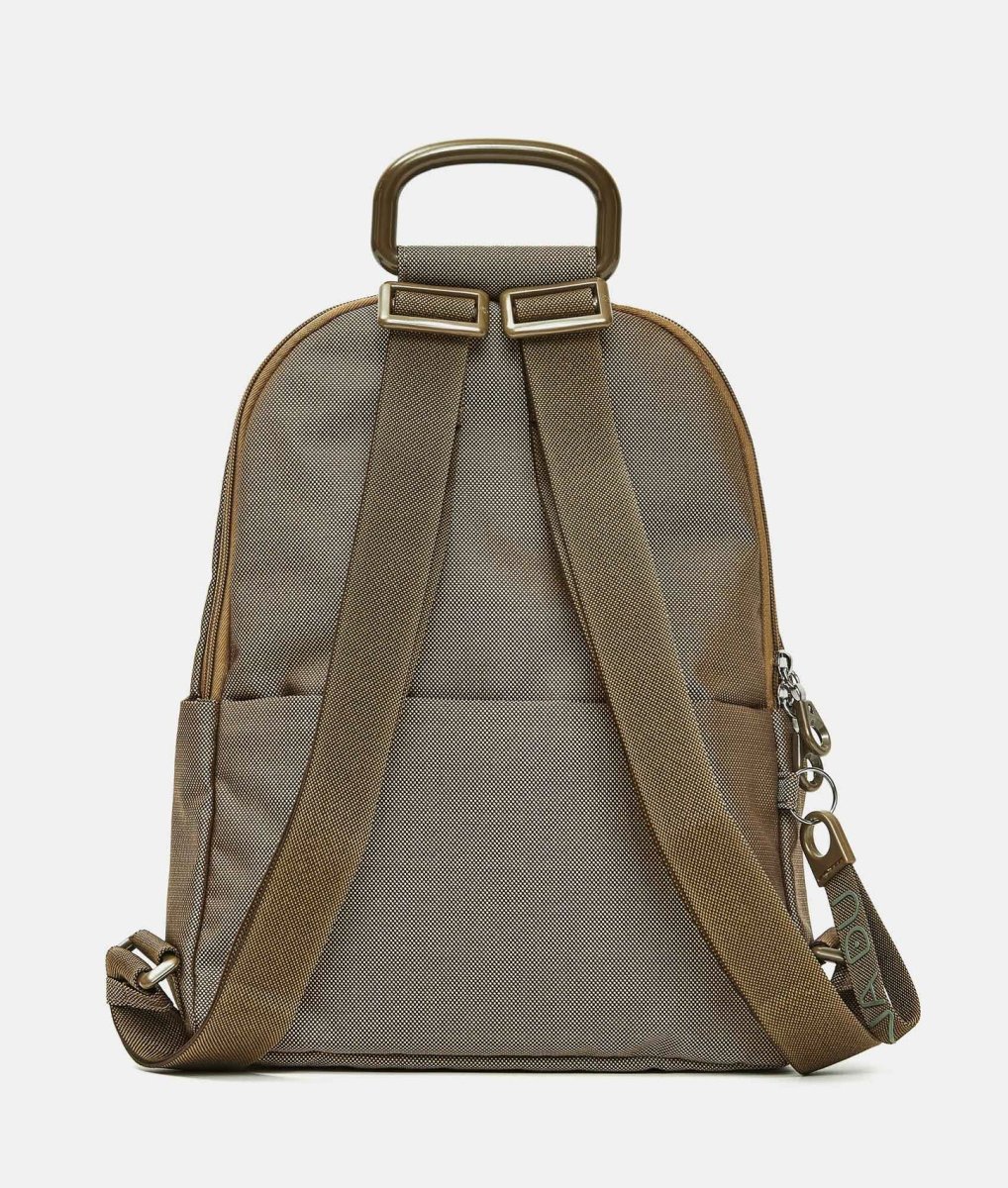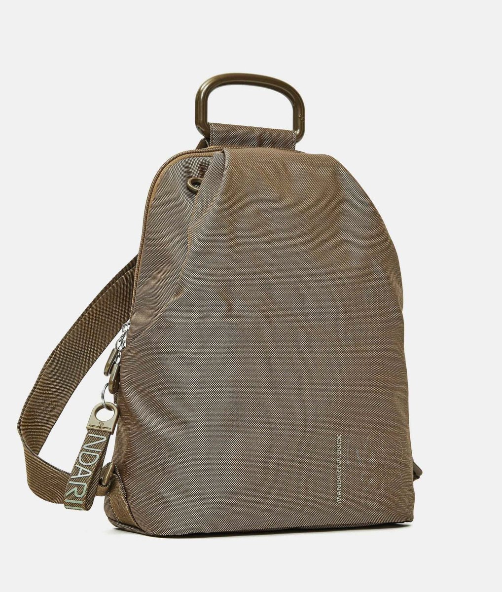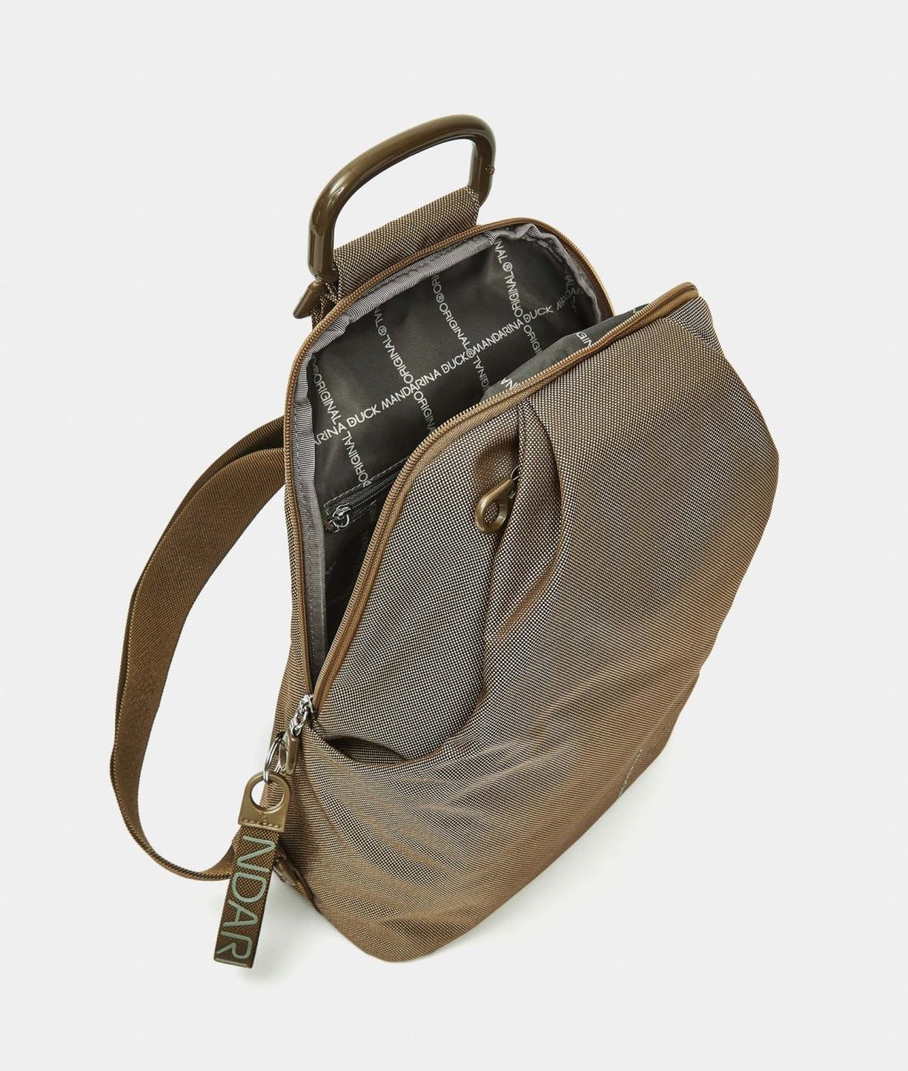 Zaino con manico e tasche laterali con zip in tessuto. Dettagli personalizzati e spallacci regolabili in jacquard.