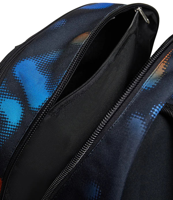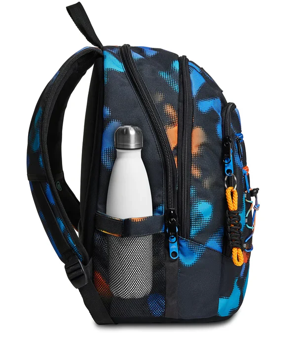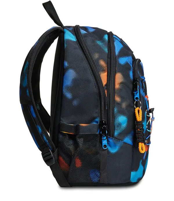- Zaino doppio scomparto con SPEAKER WIRELESS removibile su spallaccio con microfono incorporato, apertura dello scomparto principale facilitata , doppia zip su tasca frontale, cordino elastico sfumato fermamateriali con stopper, tirazip in cordoncino incrociato