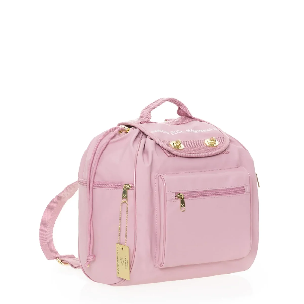Zaino Utility Foxglove Mandarina Duck, iconico accessorio a spalla realizzato in tessuto sintetico. Funzionale e pratico, con spallacci in nastro regolabili, manichetto superiore e tasche esterne laterali e frontale con zip. Il comparto principale è chiusura con patta e coulisse, l’interno è foderato.